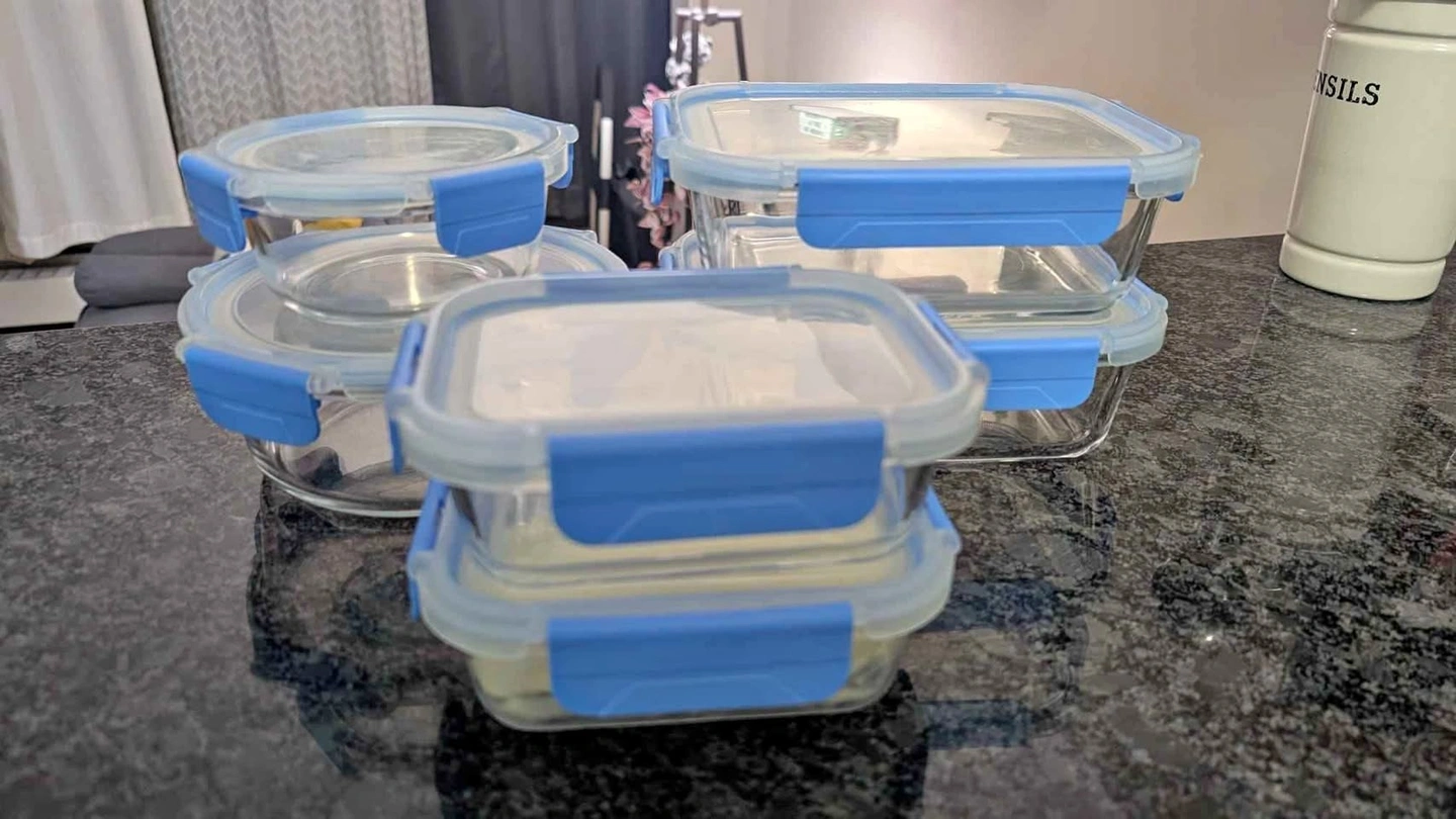 Glass food storage containers. Microwave, freezer, dishwasher, and oven safe (upto 400°C).