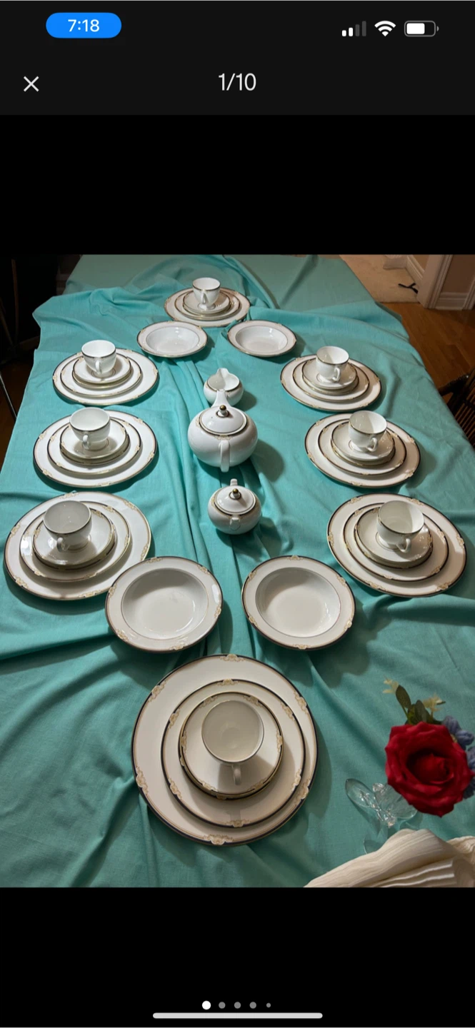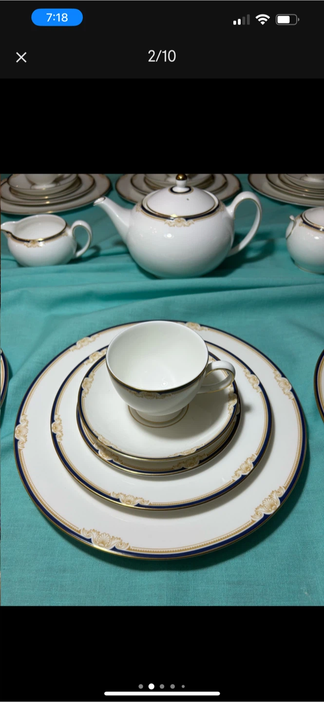 Selling a beautiful fine china dinnerware set! It includes plates, teacups, a teapot, creamer, and sugar bowl. The set is white with navy and gold detailing.