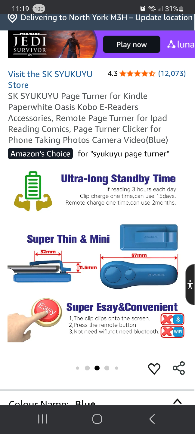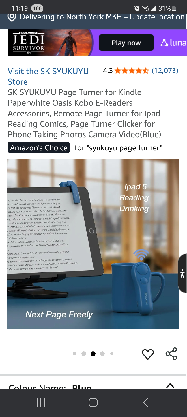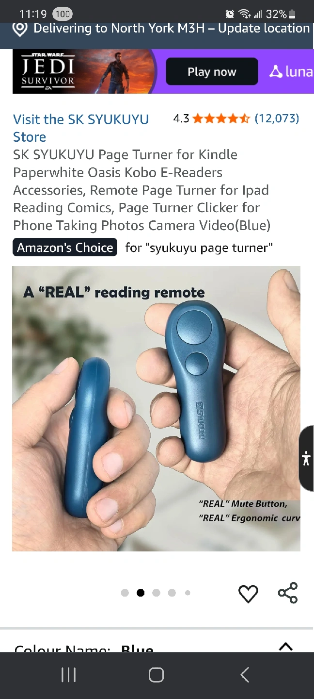 Selling a SK SYUKUYU page turner, perfect for your Kindle, iPad, or Kobo e-reader! It's a remote page turner that makes reading comics and books even easier. The colour is blue and it's in great condition. It's also a handy remote for taking photos and videos!
