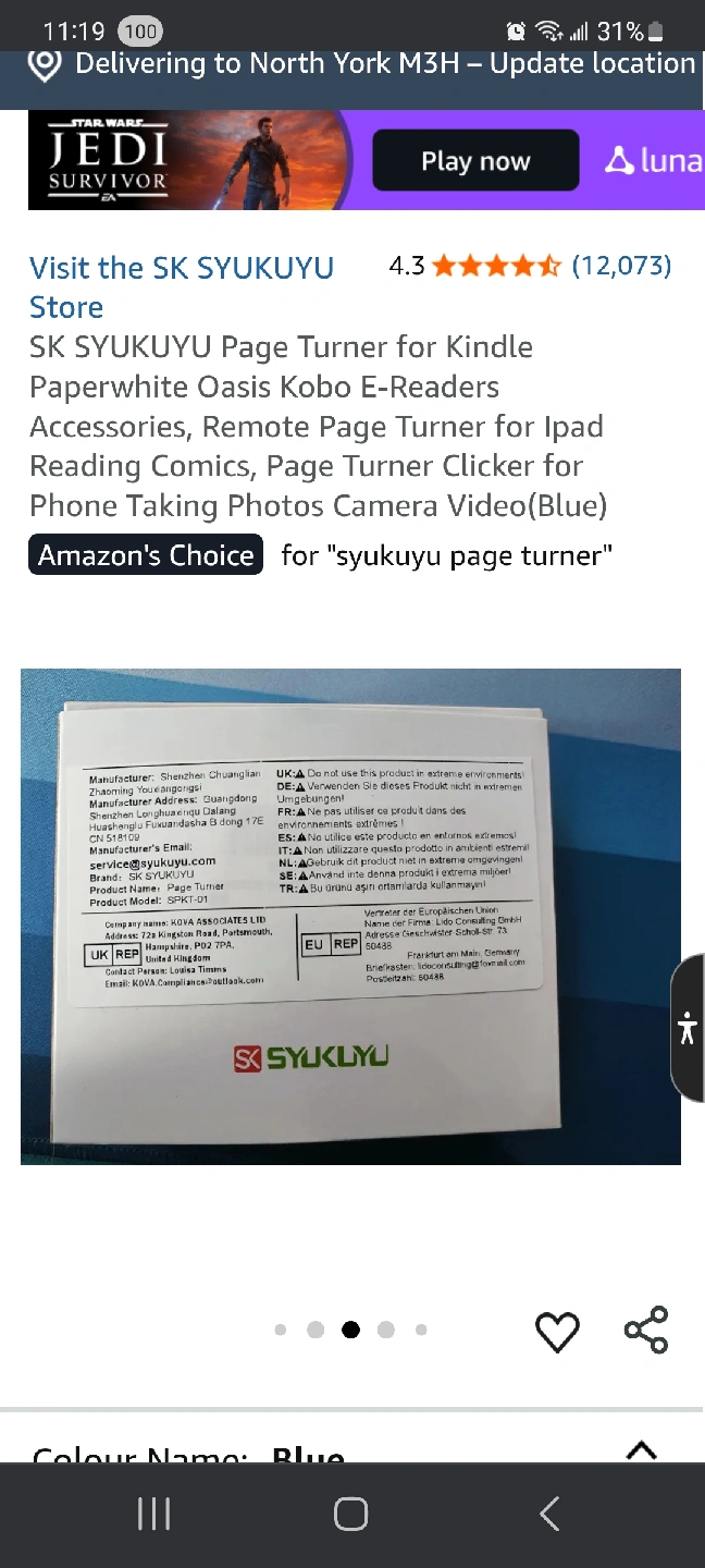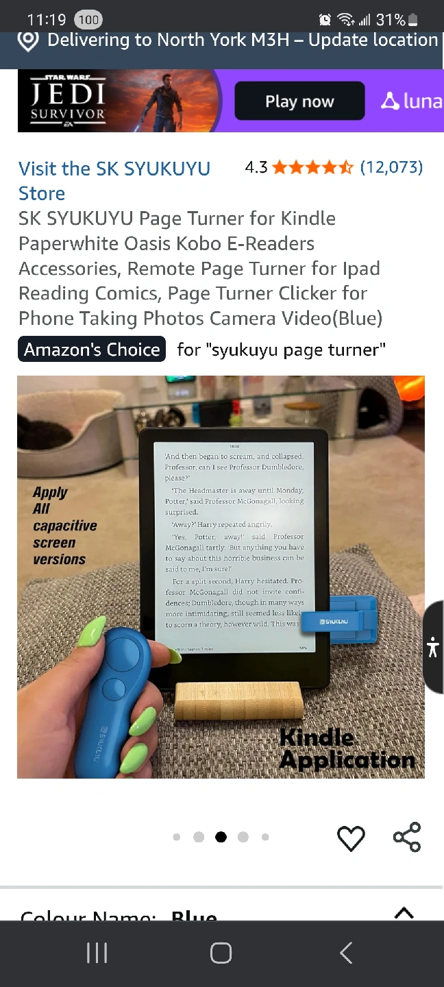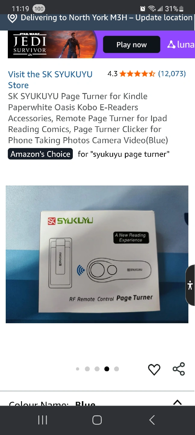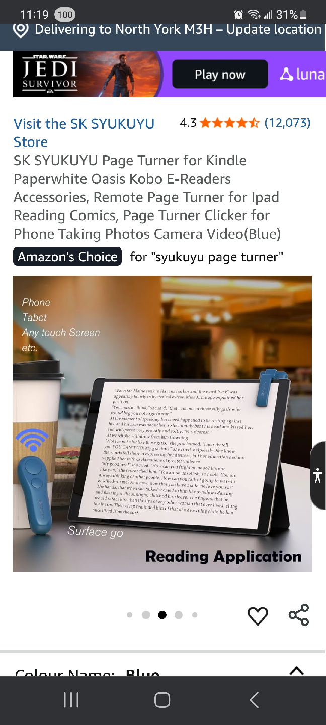 Selling a SK SYUKUYU page turner, perfect for your Kindle, iPad, or Kobo e-reader! It's a remote page turner that makes reading comics and books even easier. The colour is blue and it's in great condition. It's also a handy remote for taking photos and videos!