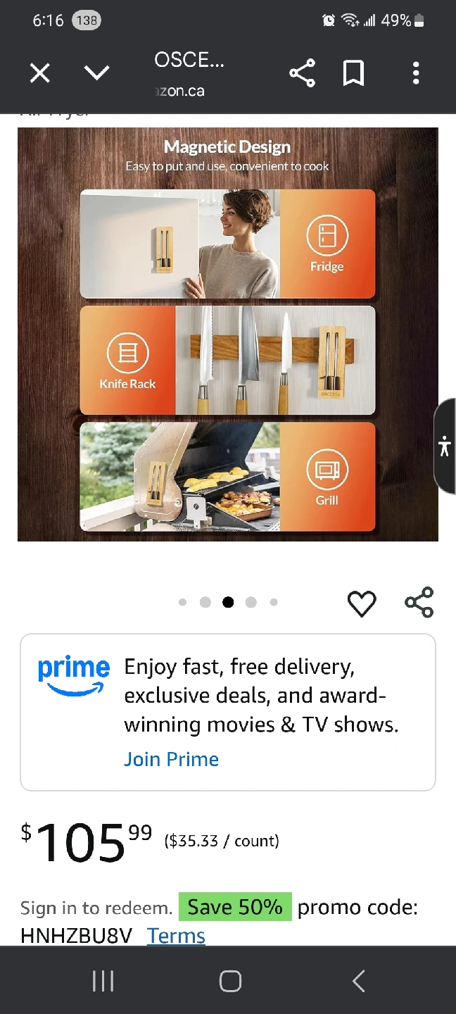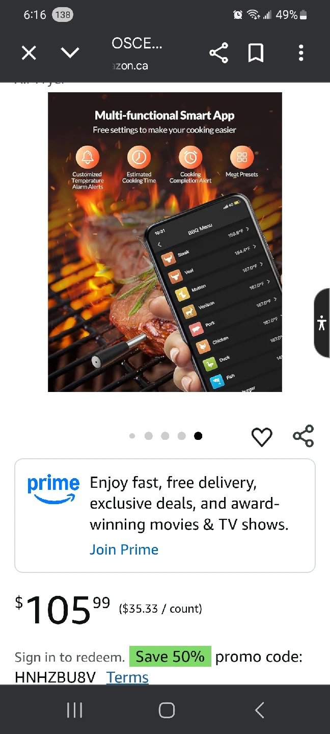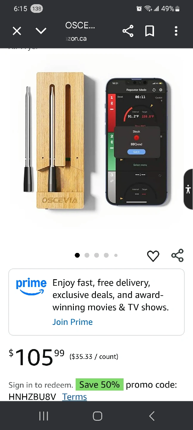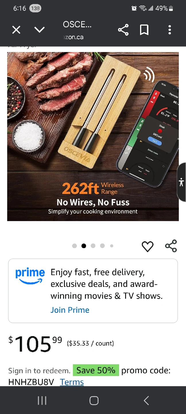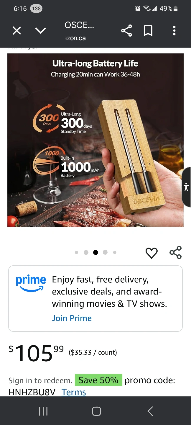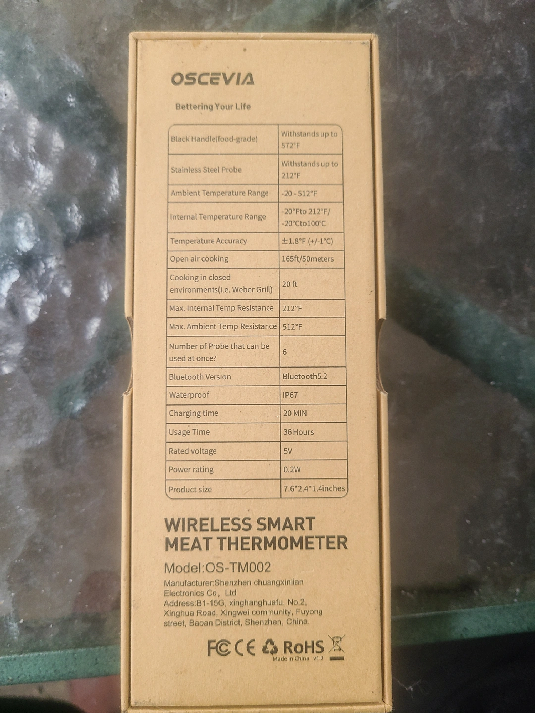 87Selling an Oscevia wireless smart meat thermometer. It has a wireless range of 262ft. It features a stainless steel probe that withstands up to 212°F. It is waterproof with an IP67 rating. Ultra-long battery life: charging for 20 minutes can work 36-48 hours