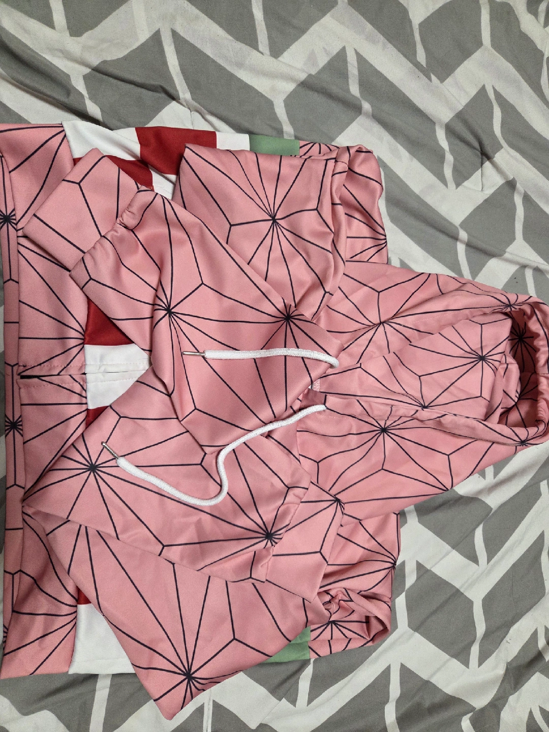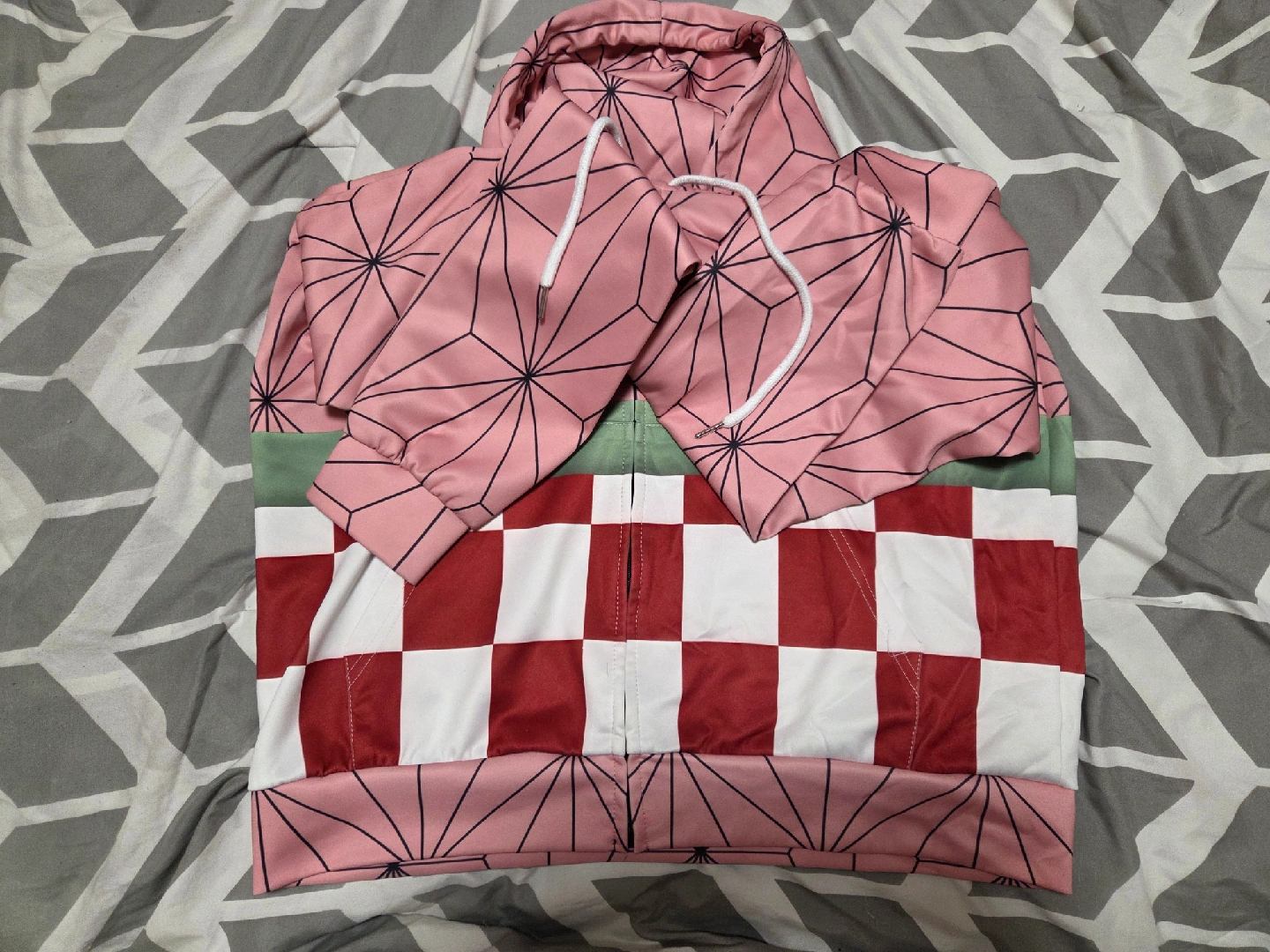 76Selling a pink Nezuko Kamado hoodie. It features a unique geometric pattern. The hoodie has a drawstring and is in great condition. size is between M to L