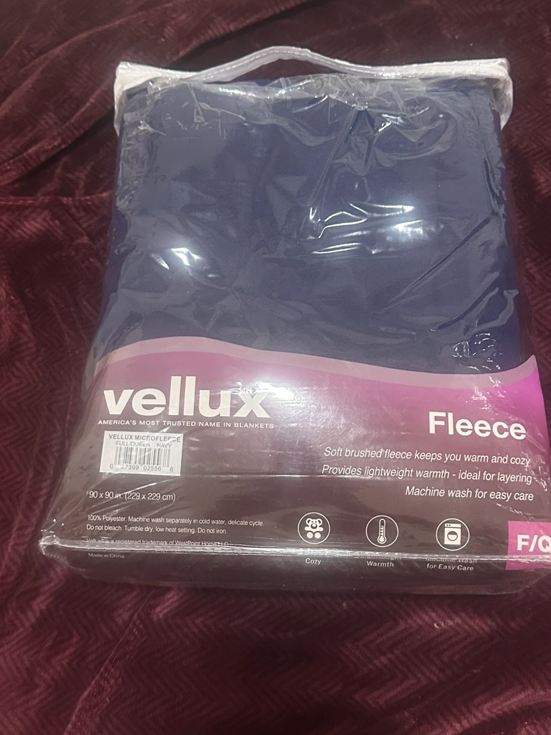 15Selling a brand new Vellux Microfleece blanket in Full/Queen size and a lovely navy colour! It's still in its original packaging. This fleece blanket is incredibly soft and cozy, perfect for adding a layer of warmth. It's also machine washable for easy care. The dimensions are 90 x 90 inches (229 x 229 cm)