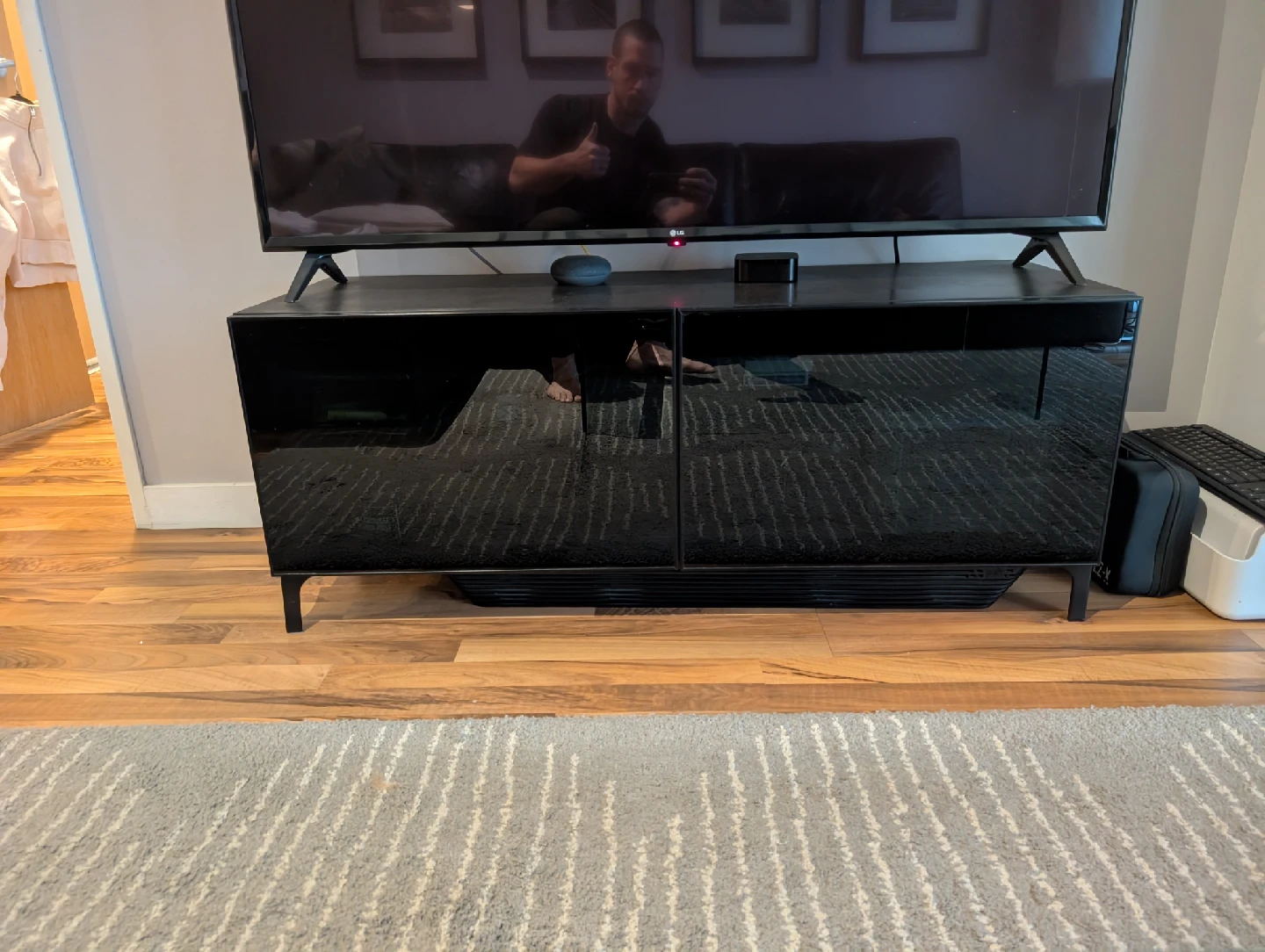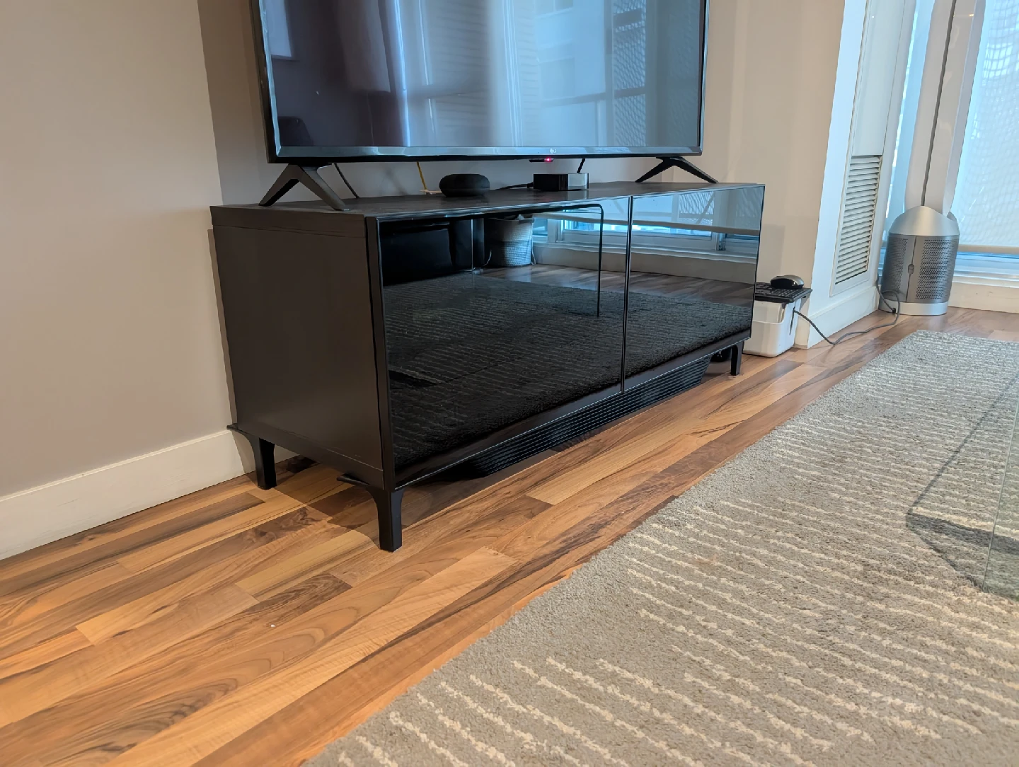 Selling a black IKEA Besta TV stand. upgraded with glass doors and metal legs. It's in great condition and ready for a new home. Perfect for organizing your media and adding a sleek look to your living room