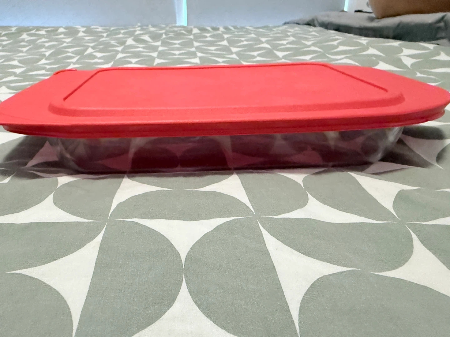 Selling a Pyrex baking dish with a red lid! It's a 7x11 inch dish, which is about 17.5 x 28 cm. It can hold 2 quarts or 1.9 litres. Perfect for baking up your favourite recipes