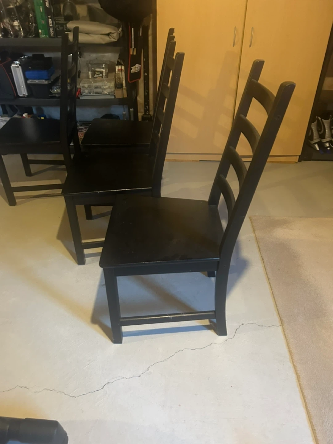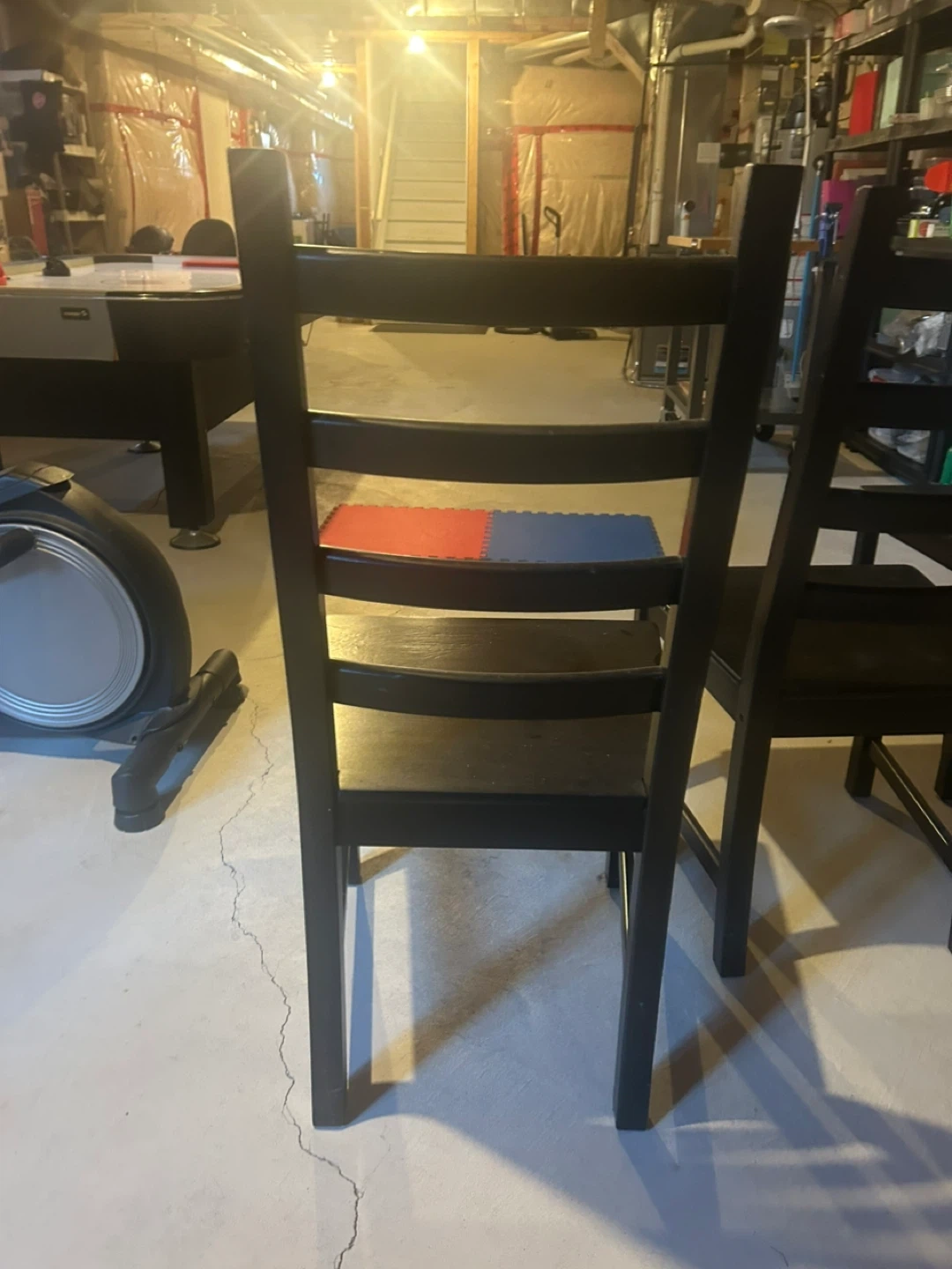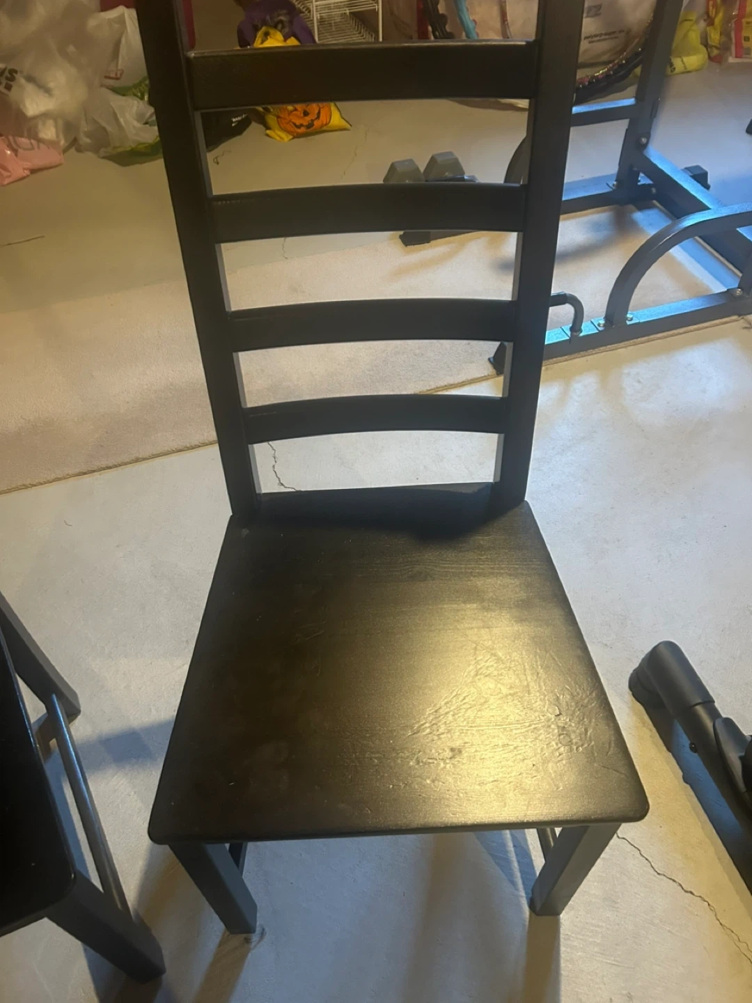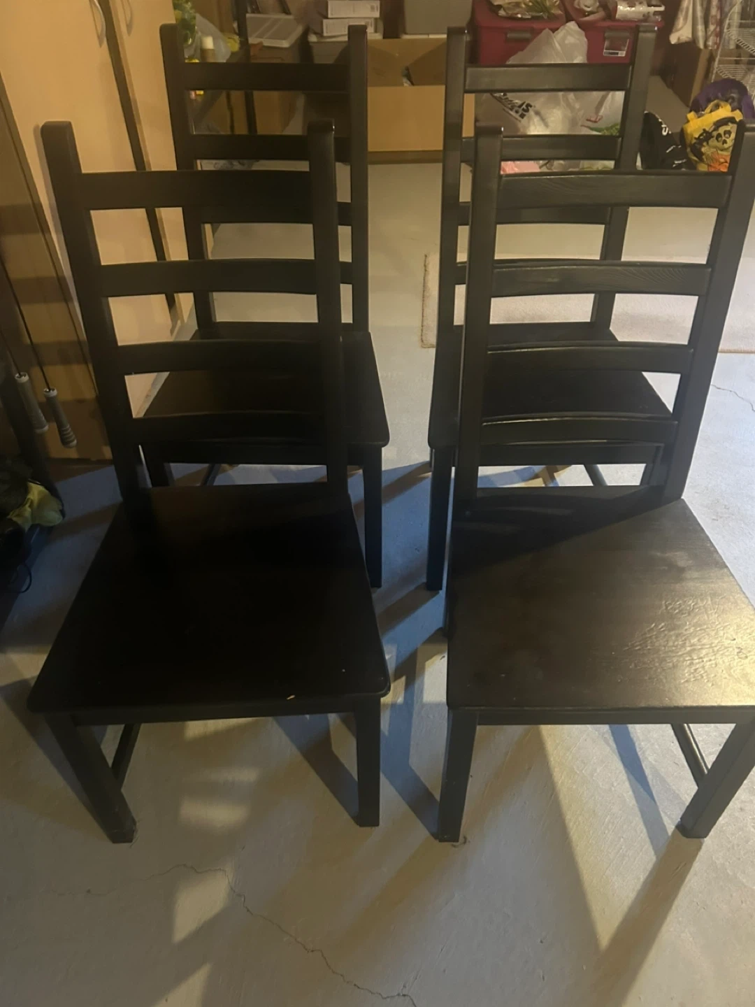 47Selling a set of four sturdy black wooden dining chairs. They have a classic ladder back design and are in good condition, perfect for adding extra seating to your dining area or kitchen! 20$ for each.