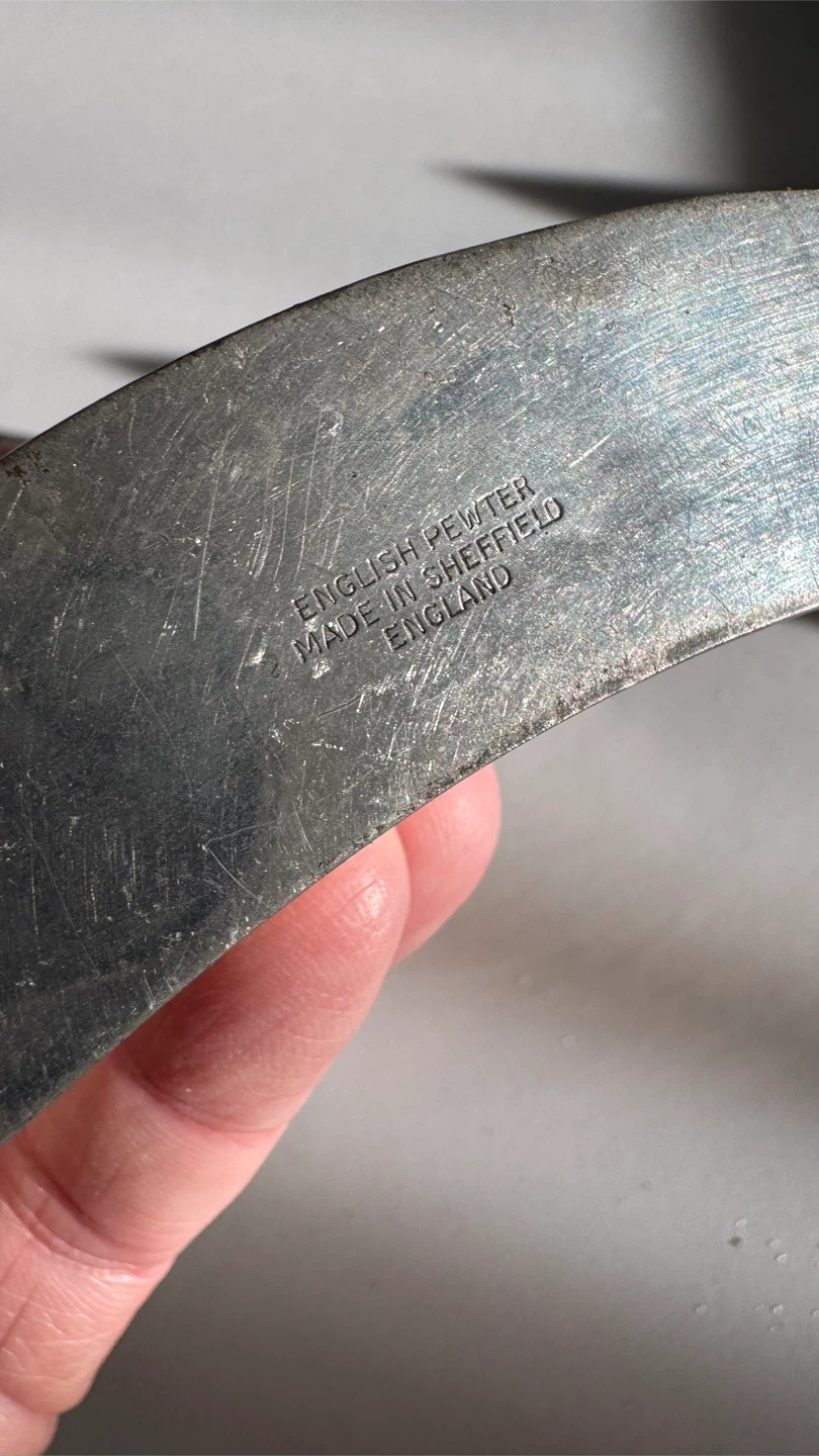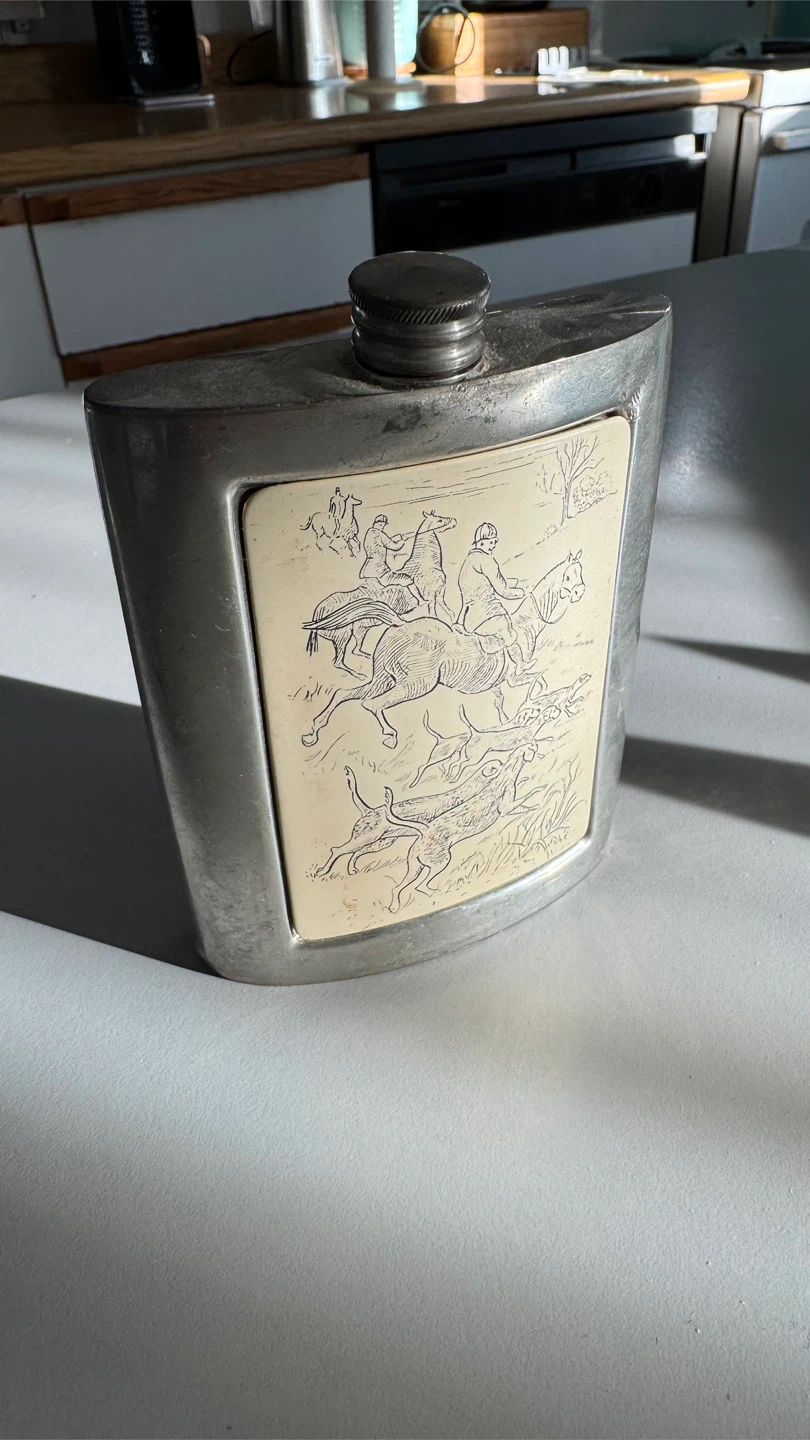 Selling a unique English Pewter flask, made in Sheffield, England. It has a lovely design featuring a hunting scene. A great piece for collectors or anyone who appreciates vintage items!