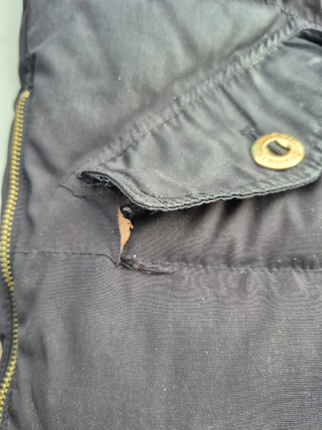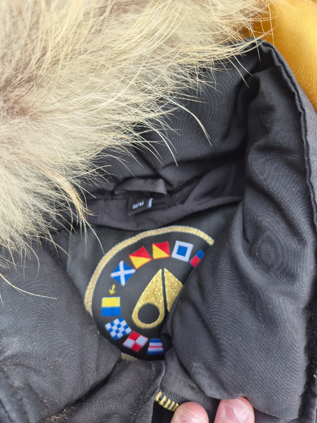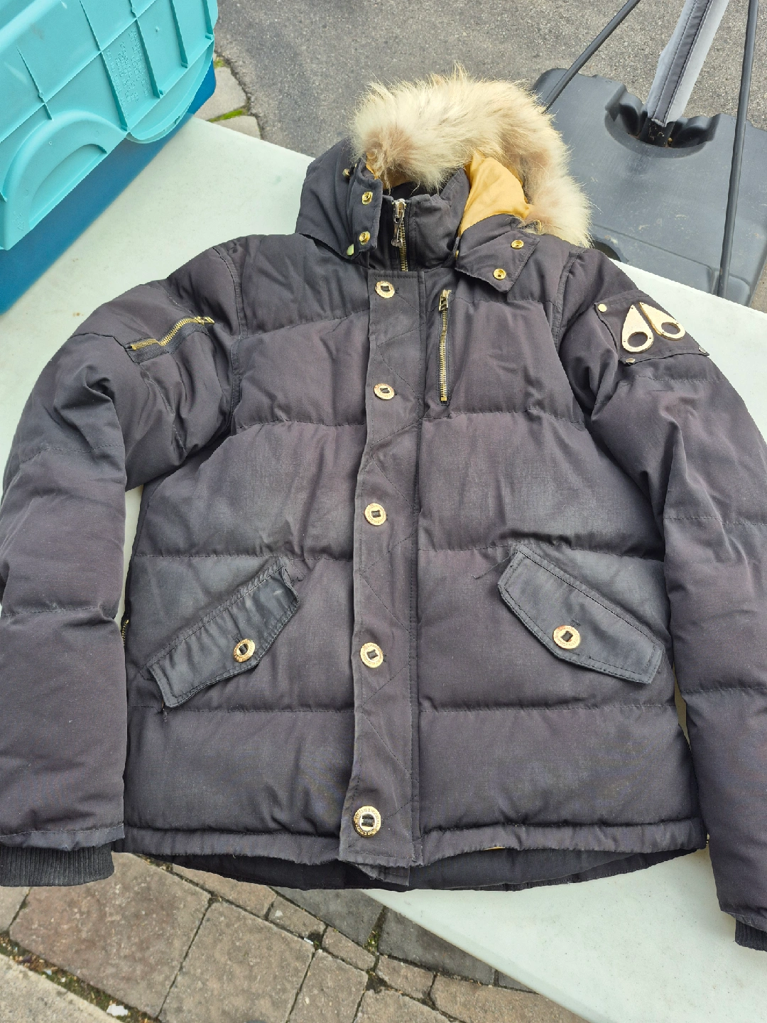 98Selling a Moose Knuckles down parka in size M. The jacket is black with gold accents and a fur-trimmed hood. Please note there is a tear on the pocket.