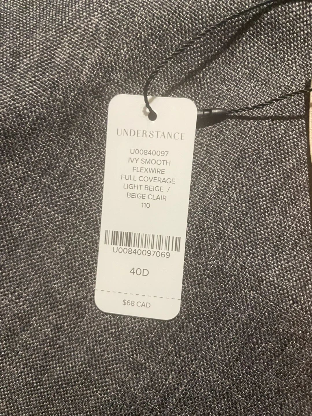 This is an Understance Ivy Smooth Flexwire full coverage bra in light beige. It's a size 40D and originally cost $68 CAD. Brand new with tags