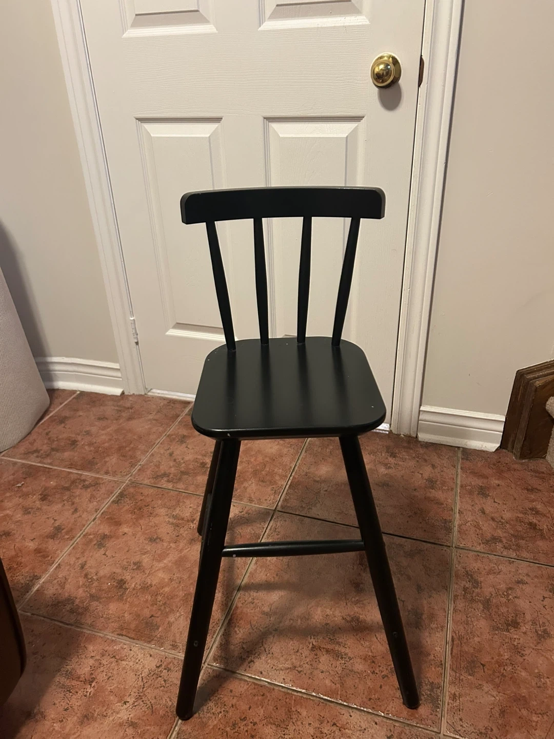 Selling a simple black wooden kid bar stool. It's sturdy and in good condition, perfect for a kitchen counter or bar area. The stool has a classic design that fits well with most decor styles. It's been gently used and is ready for a new home!