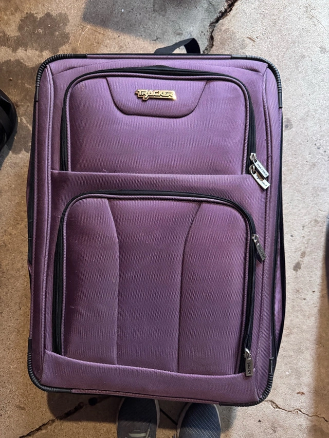 I'm selling a used Tracker purple luggage, perfect for your travel needs. This Tracker luggage has two front pockets and a retractable handle. It's in good condition and ready for its next adventure.