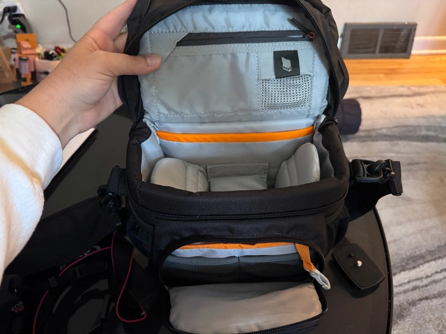 51This is a used Lowepro camera bag in good condition, perfect for carrying your camera and accessories. It features a padded interior, adjustable dividers, and multiple pockets for organization. I am looking to sell it for a reasonable price. If the ad is up, it's still available!