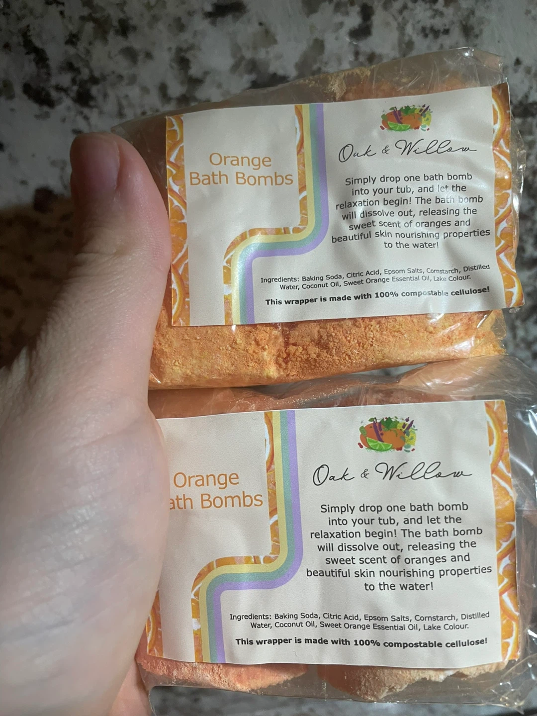 Treat yourself to the sweet scent of oranges with these Oak & Willow Orange Bath Bombs! They're perfect for a relaxing soak in the tub, releasing the beautiful skin-nourishing properties to the water! The wrapper is made with 100% compostable cellulose, One pack is partially destroyed so you can use it as a bath powder