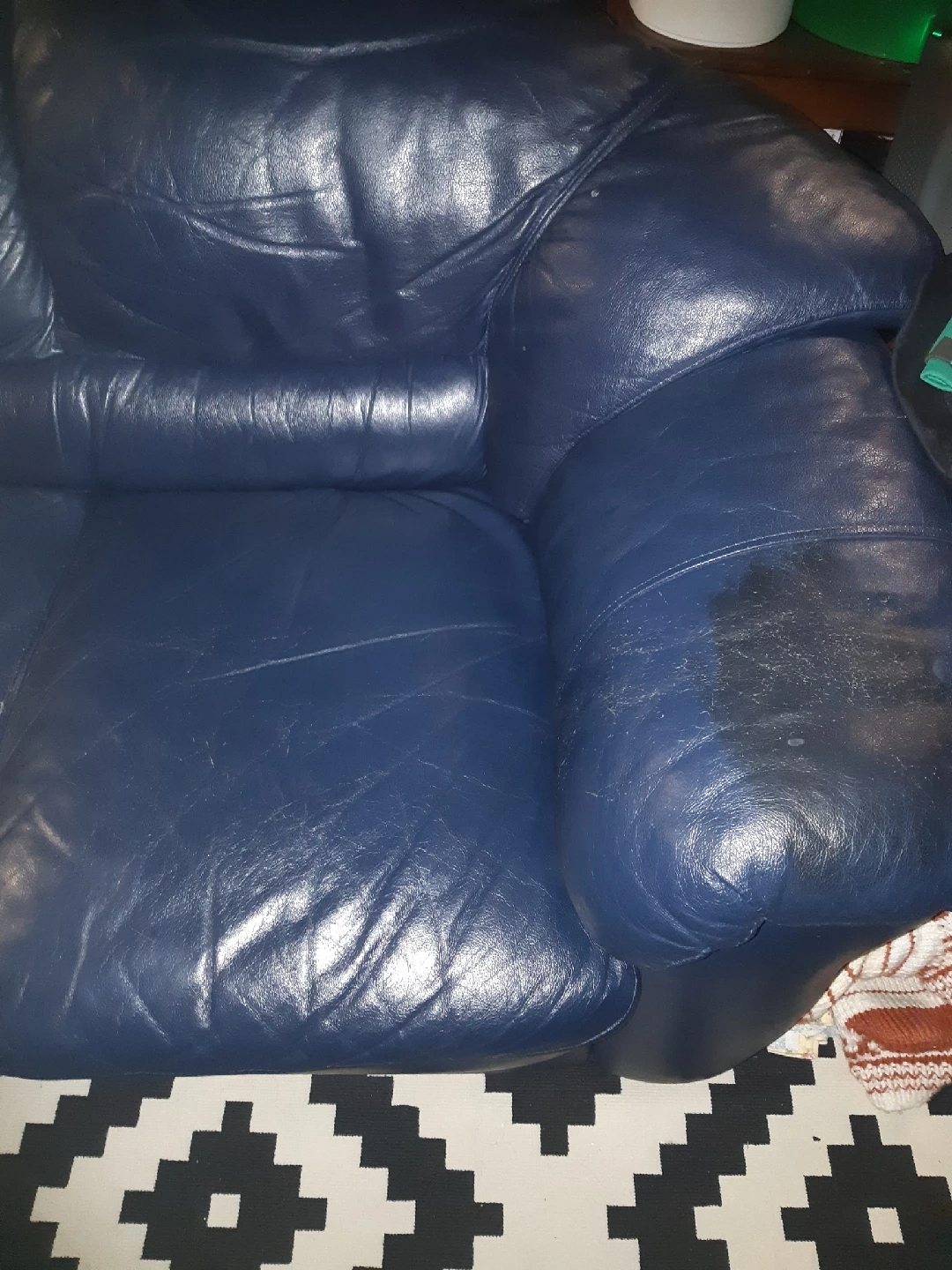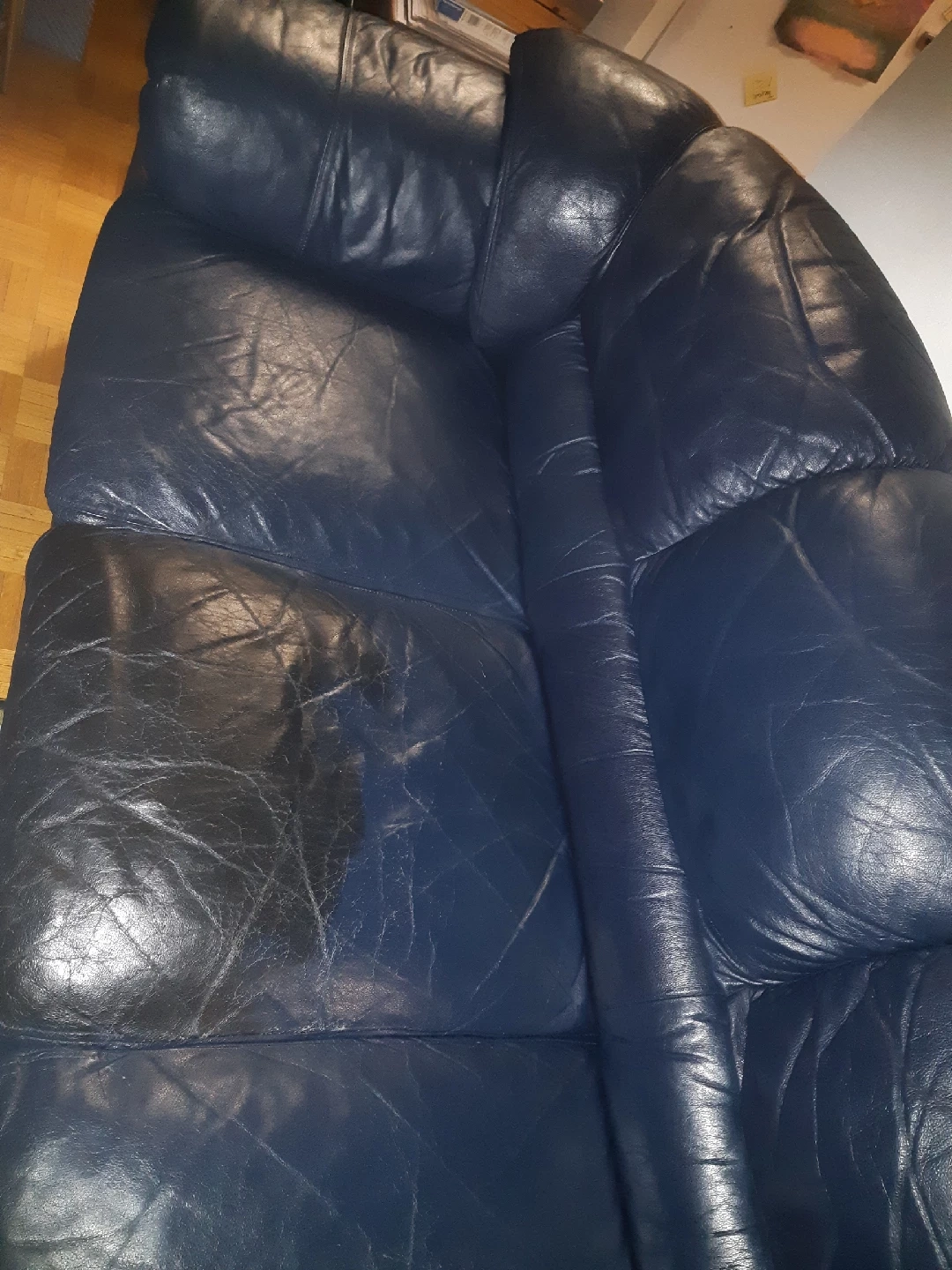 1000+A comfy blue geniune leather sofa. It has some signs of wear, but is still in good condition for relaxing and very comfortable. Bought from The Bay long time ago.