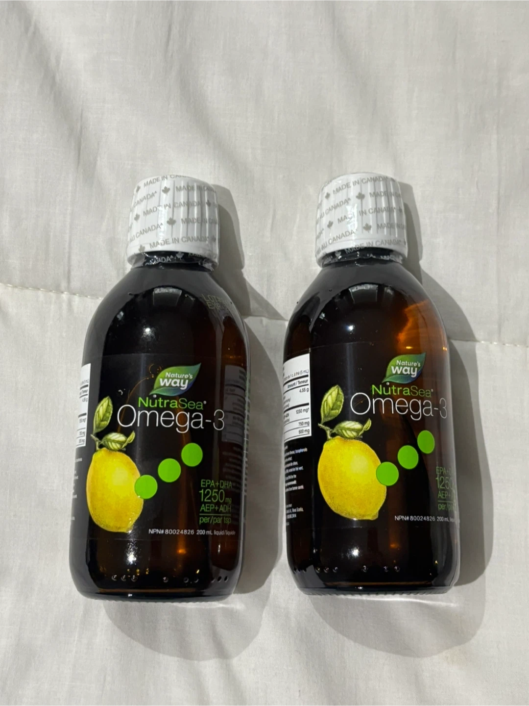 Selling two bottles of Nature's Way NutraSea Omega-3 with a zesty lemon flavour! Each bottle contains 200 ml of liquid. Just one teaspoon a day provides a clean, light taste and is easy to absorb. They expire in 2026 August, so you have plenty of time to use them!