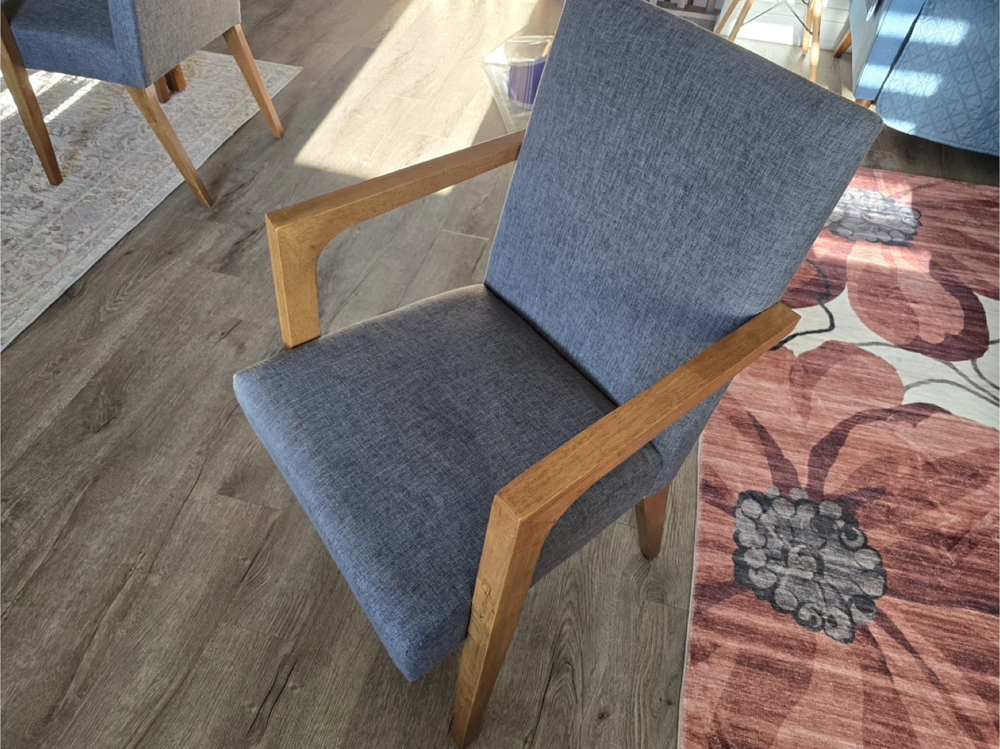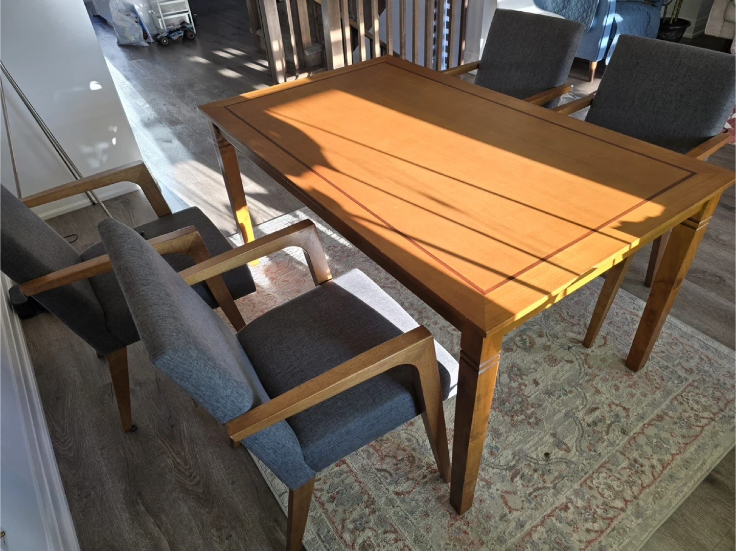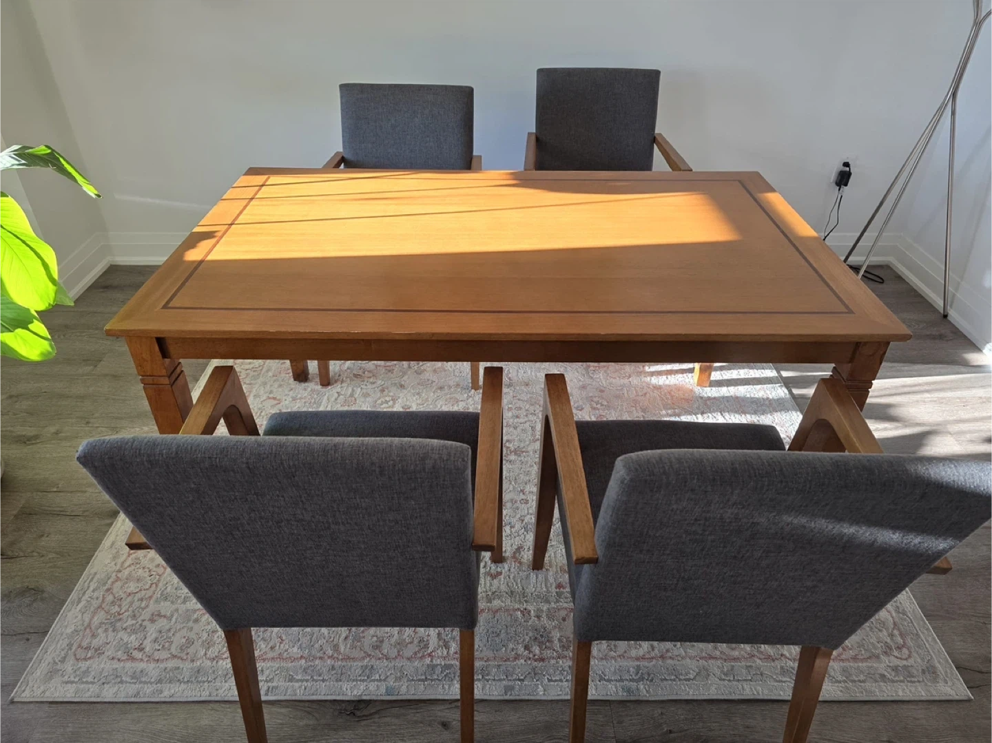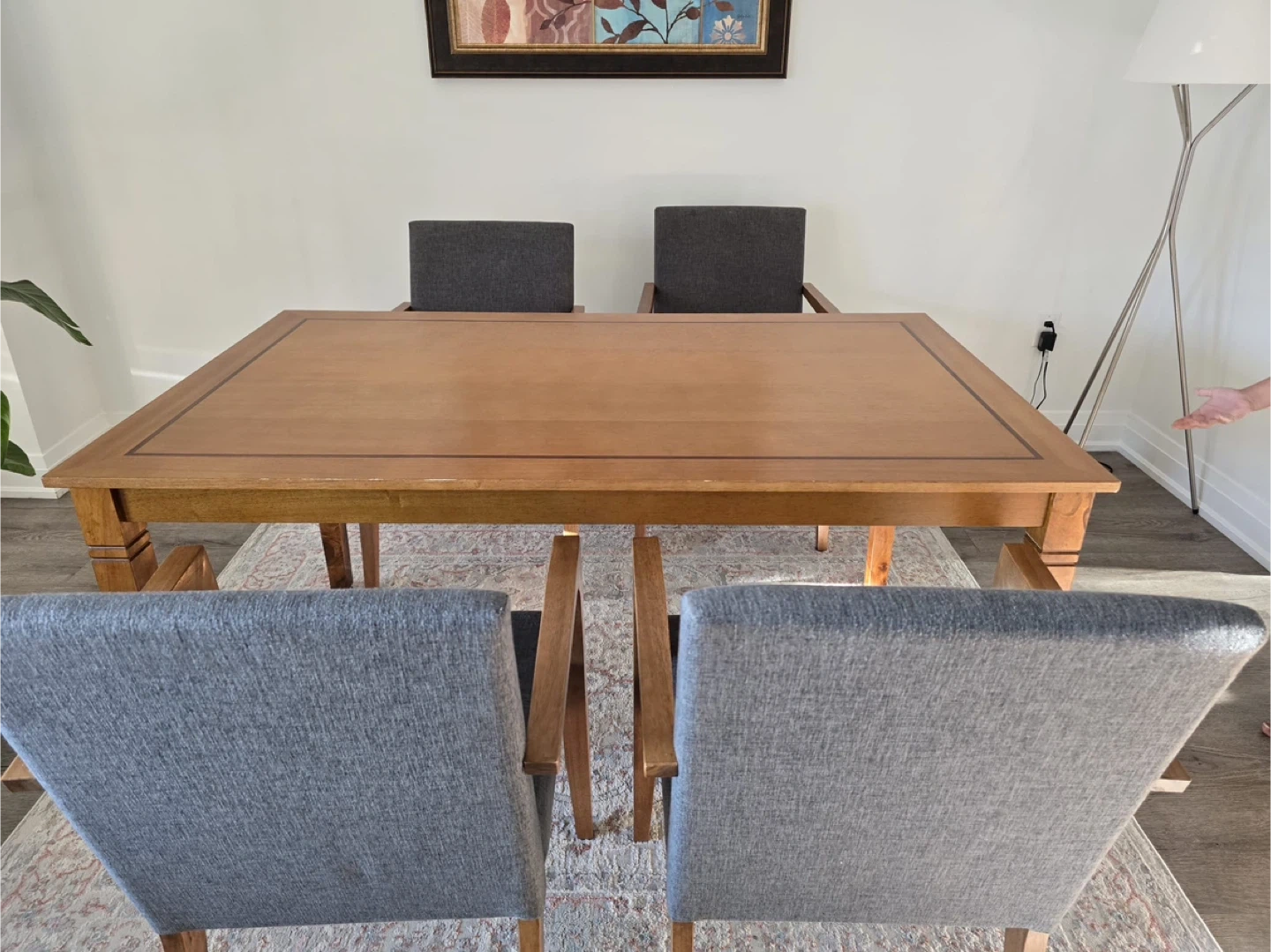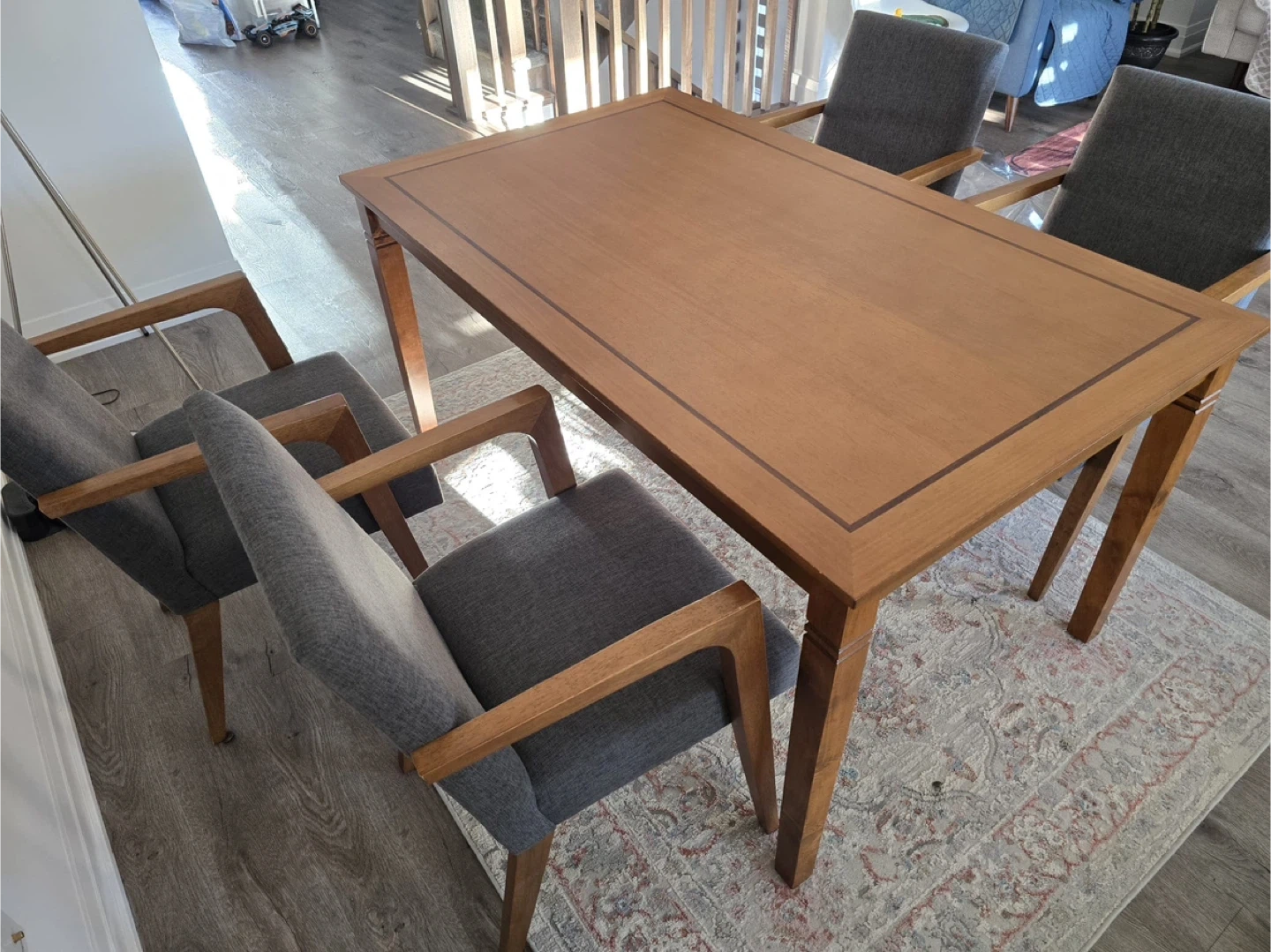 Selling a dining table with four chairs. The chairs are upholstered in a grey fabric and have wooden frames. The table is wooden with a light brown finish. Table is from brick and chairs from structure. Can seat up to 6 comfortably