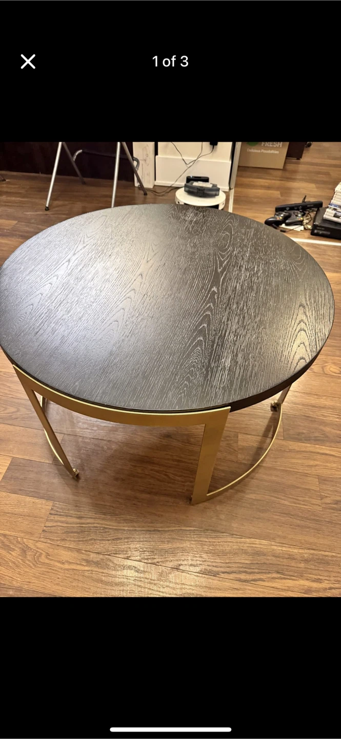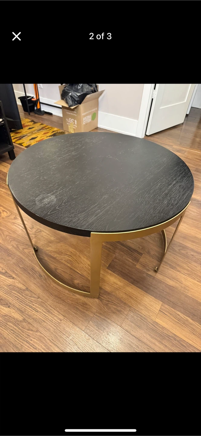 Selling a stylish round coffee table with a black top and gold-coloured legs. It's in good condition and would be a great addition to any living room! Perfect for your morning coffee or to hold your favourite books
