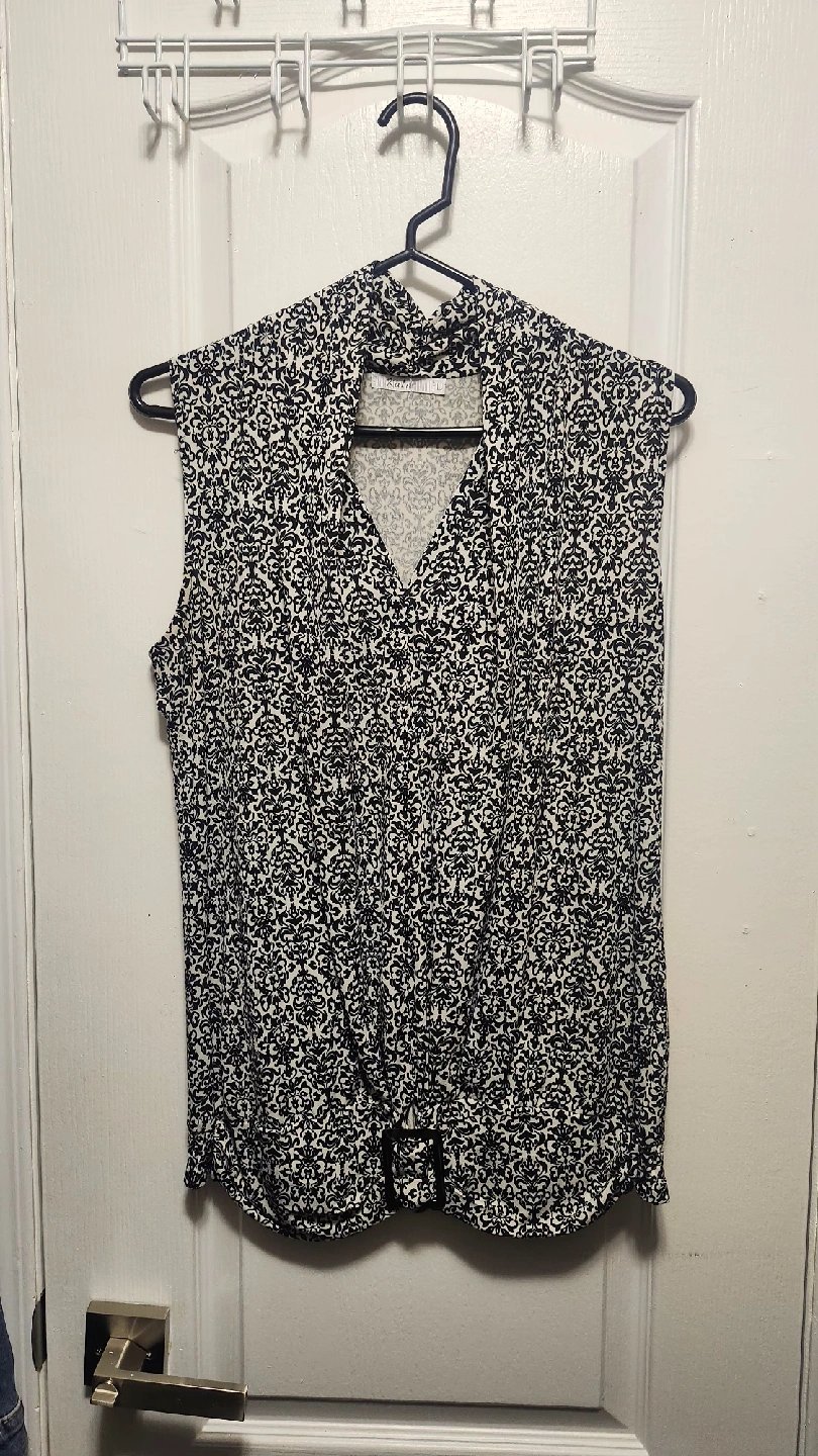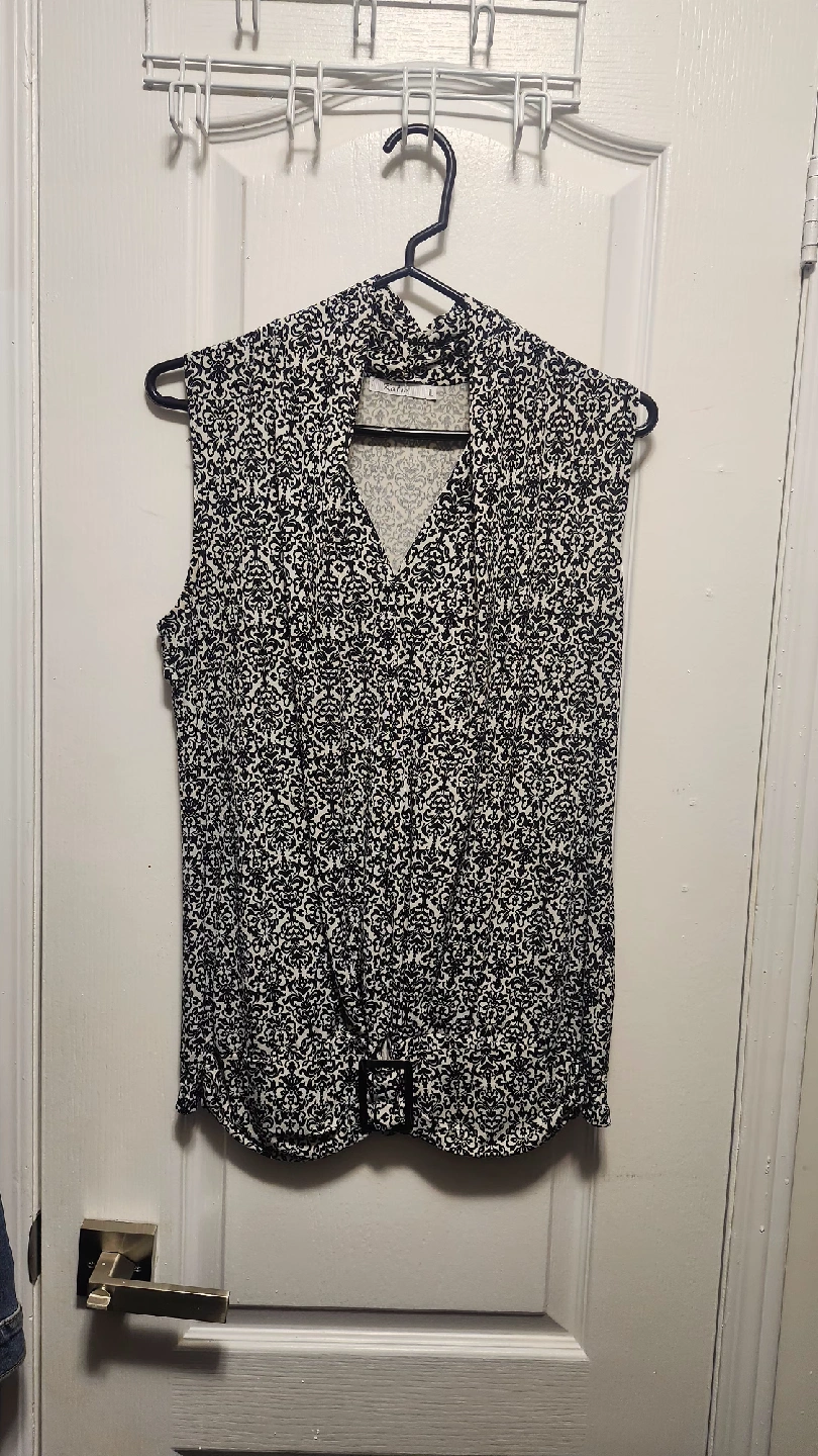 949Here's a cute Katie sleeveless blouse in size L! It has a black and white pattern. Perfect for summer days