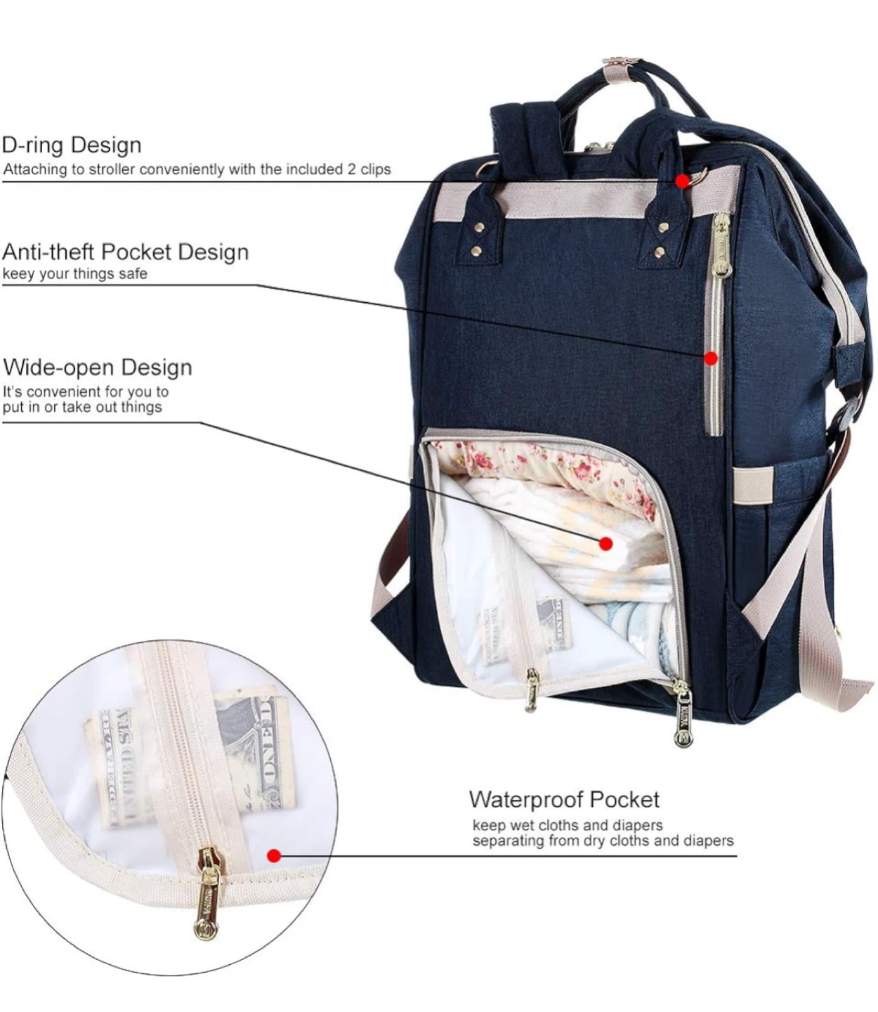 - Waterproof pocket for wet clothes and diapers