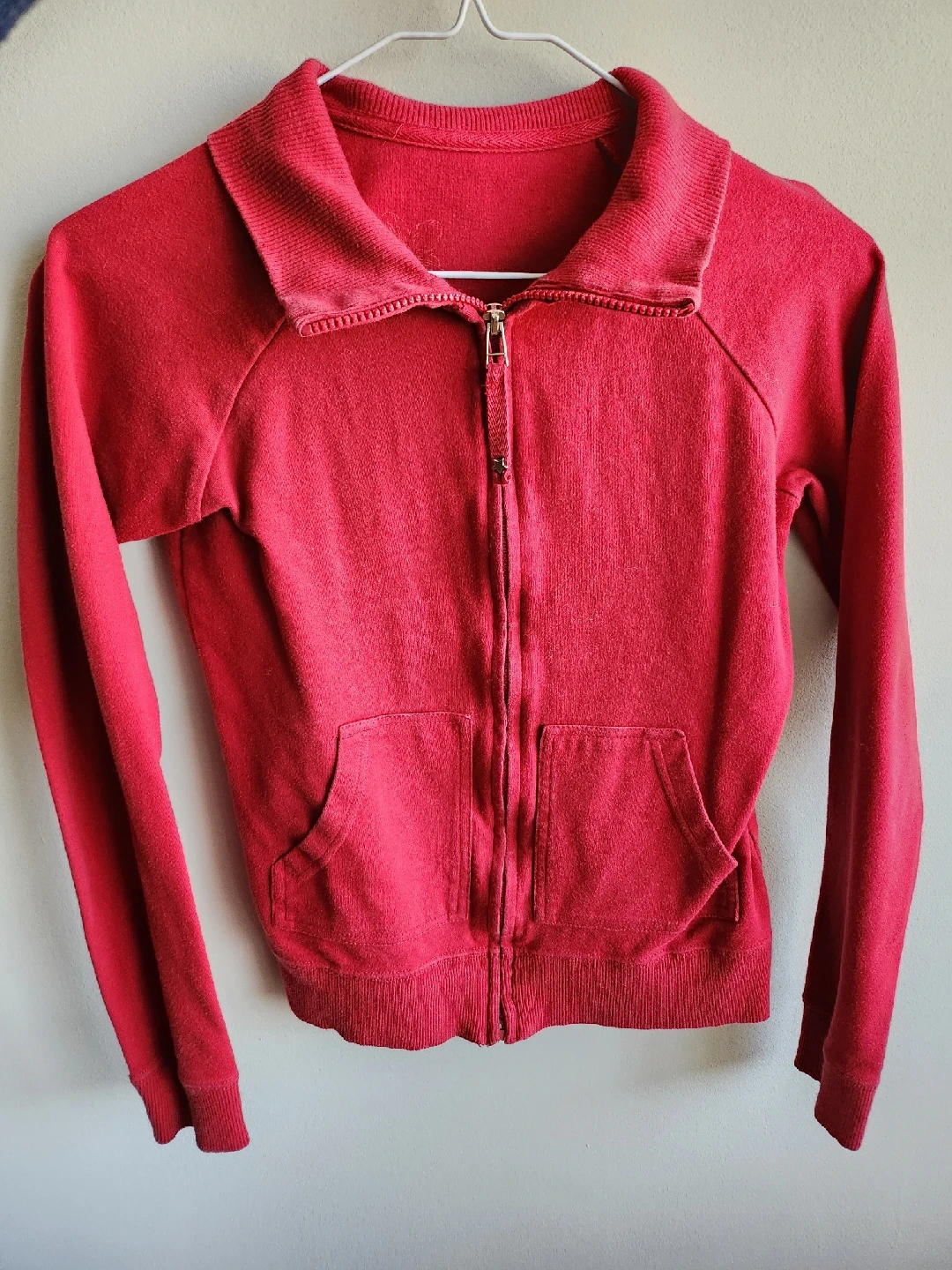 1000+Cozy red zip-up sweater with a collared neckline and two front pockets. Perfect for layering on chilly days!