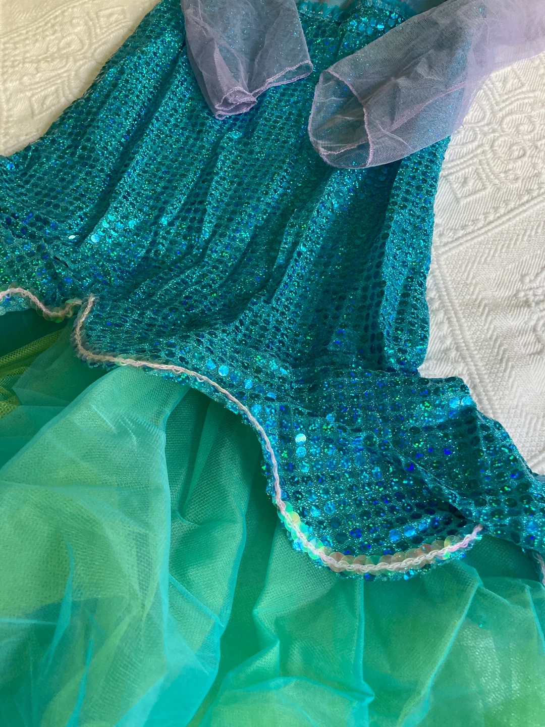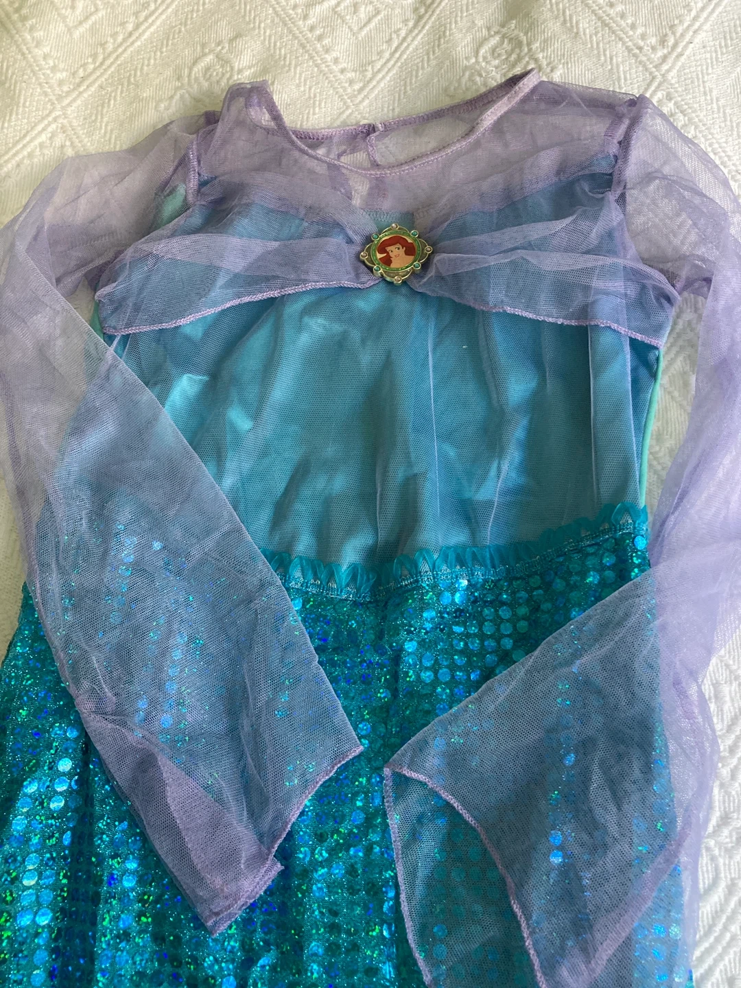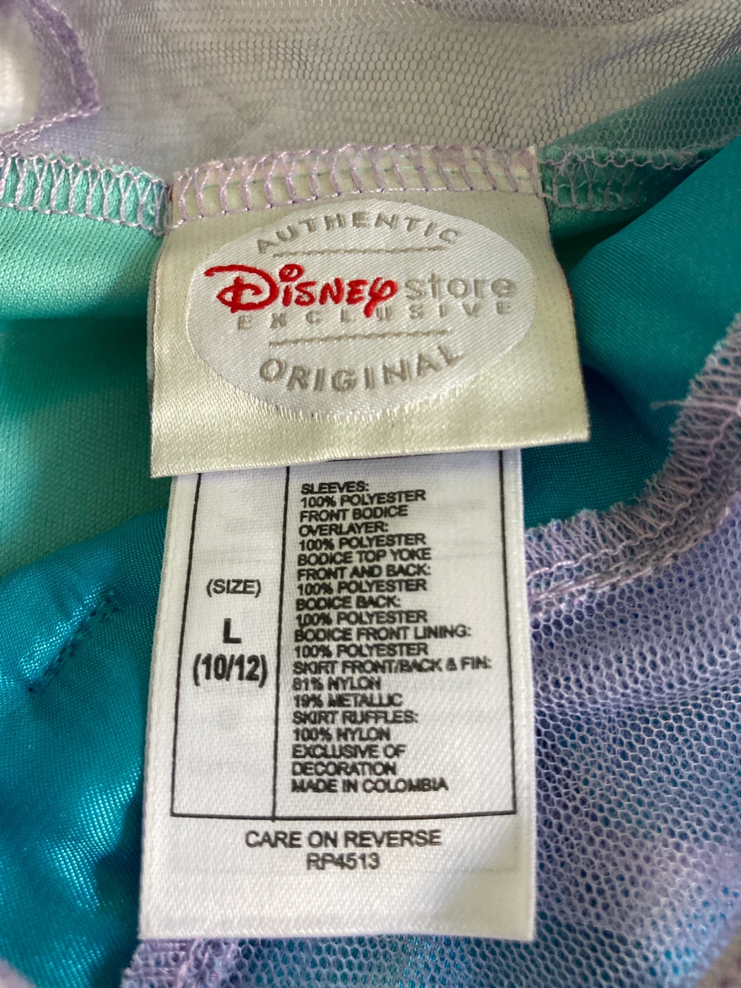 Selling a Disney Store Exclusive Ariel dress in a size L (10/12)! It's made with a blend of polyester and nylon, with some metallic detailing on the skirt ruffles. The bodice and skirt are lined for extra comfort. It's a beautiful teal and green colour with purple accents, perfect for any little mermaid fan