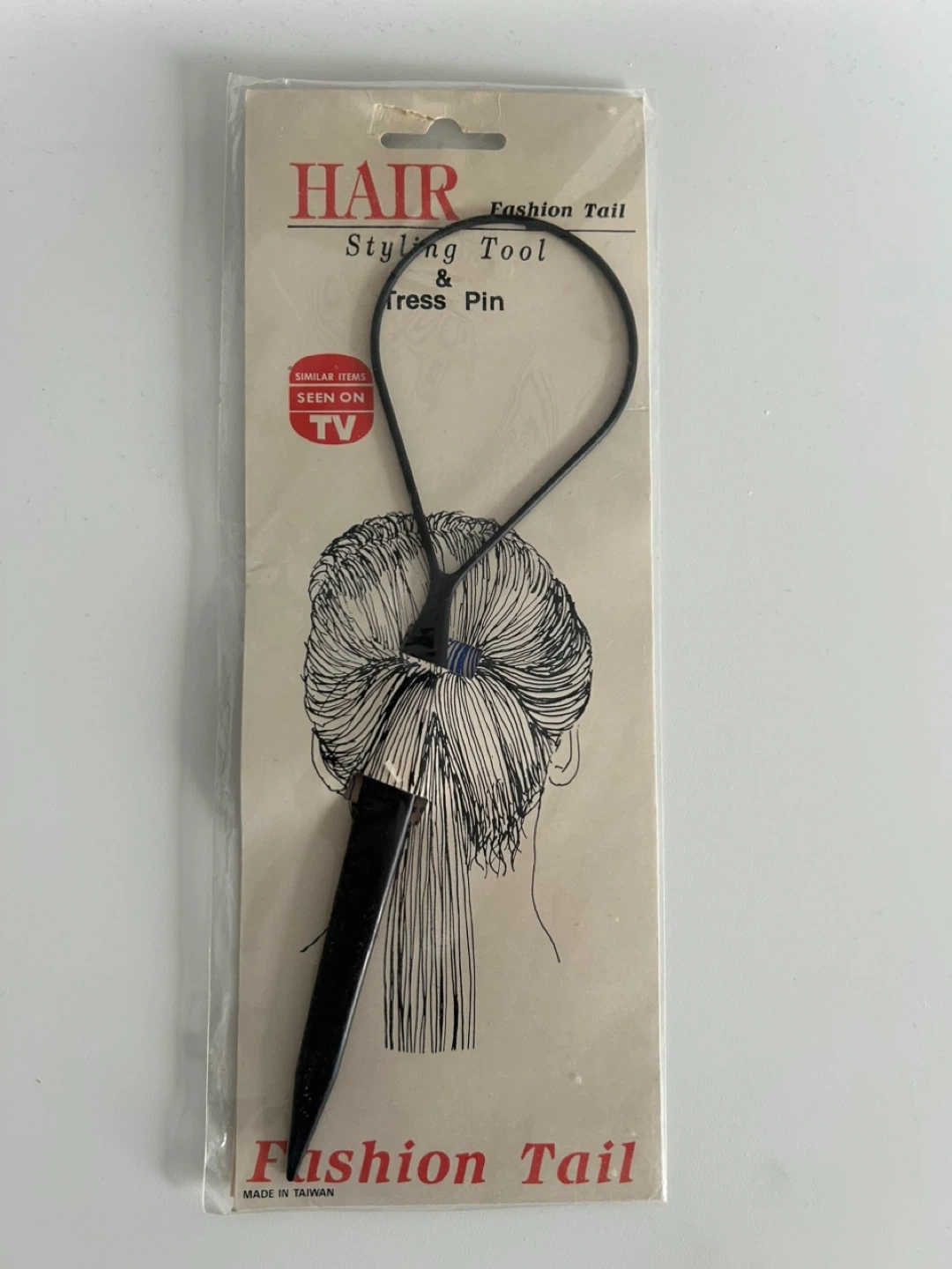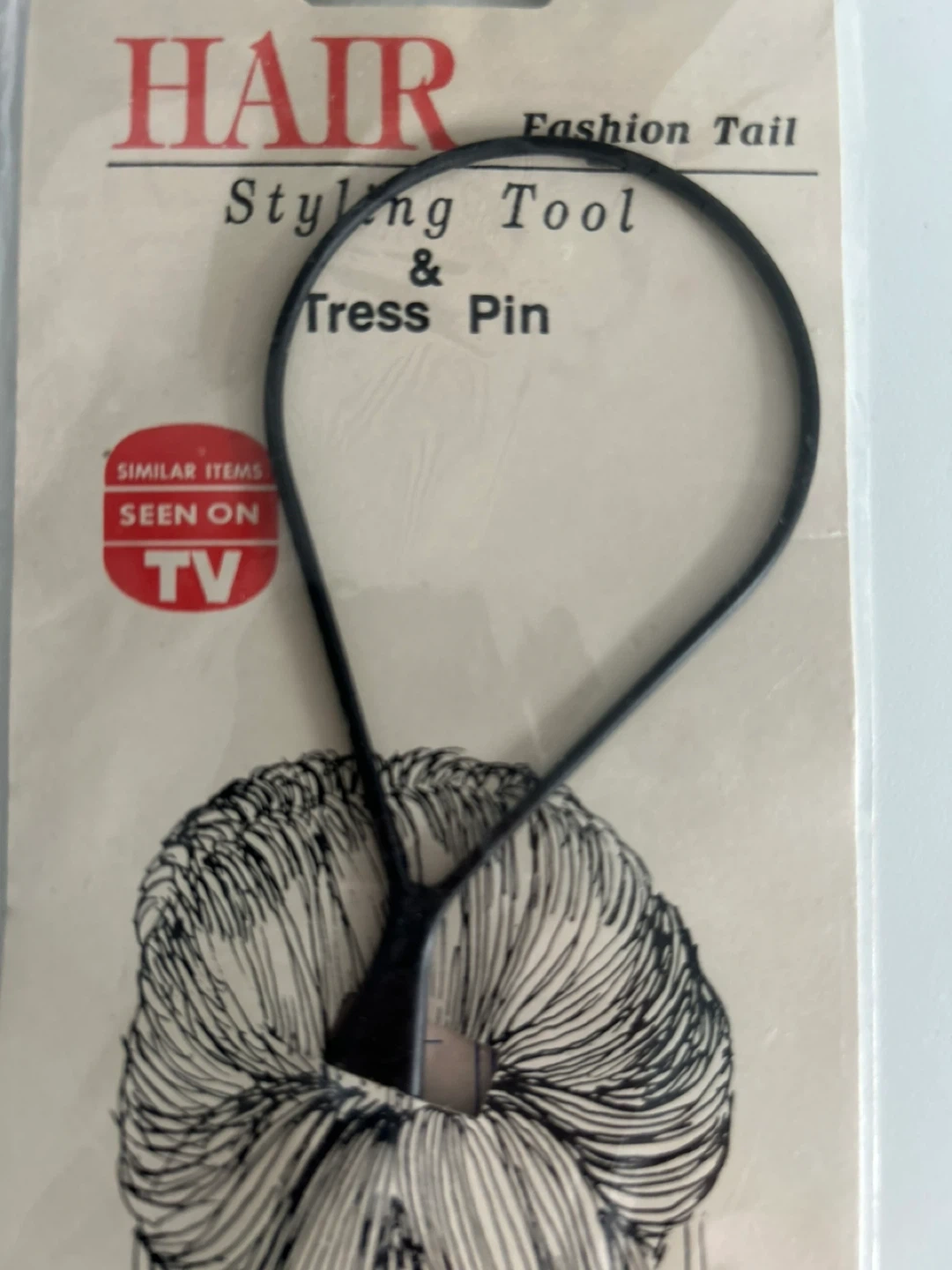 Selling a Fashion Tail styling tool and tress pin. It's a hair accessory to help you create stylish ponytails and updos. The packaging includes instructions on how to use it. Seen on TV!