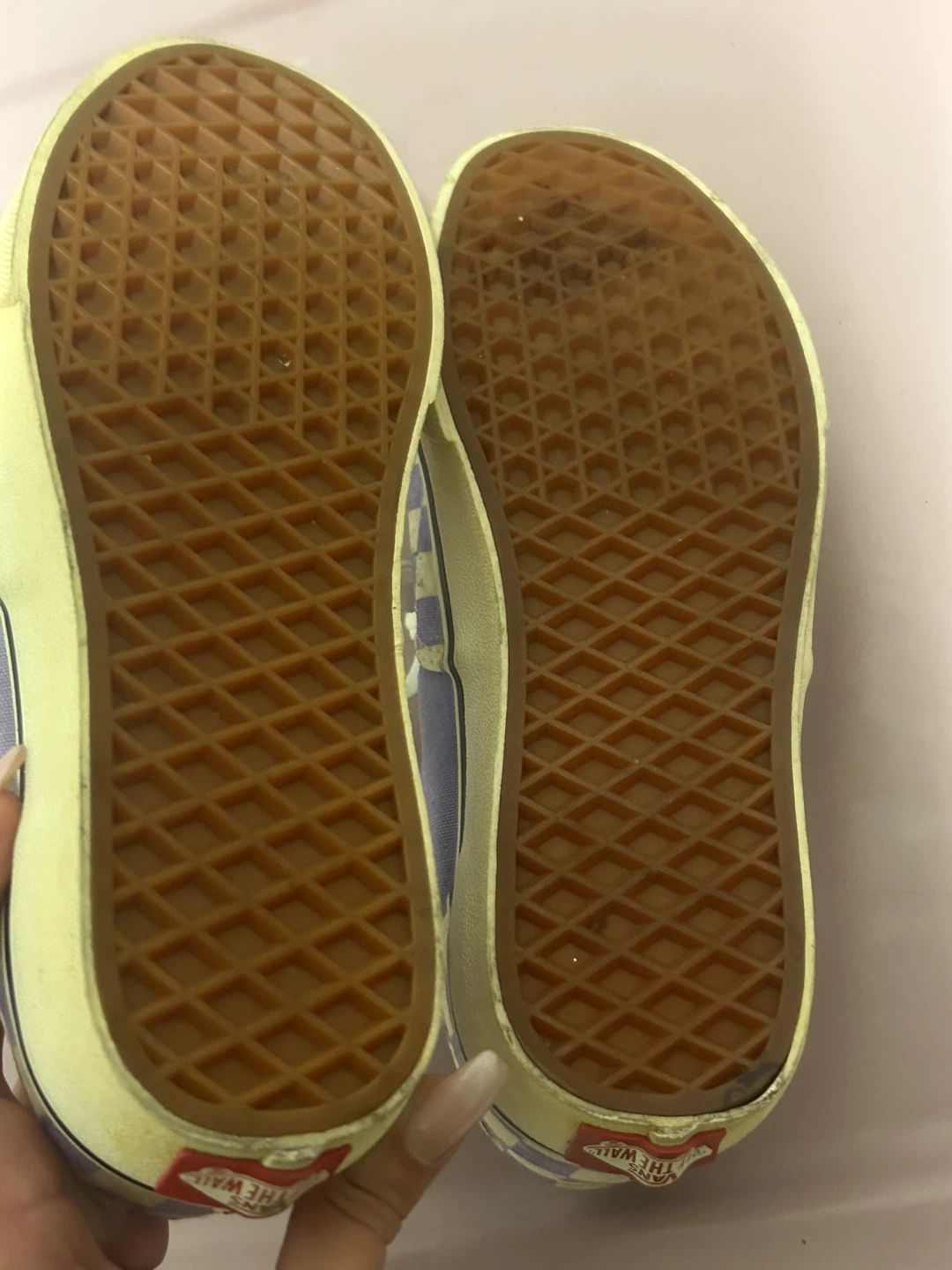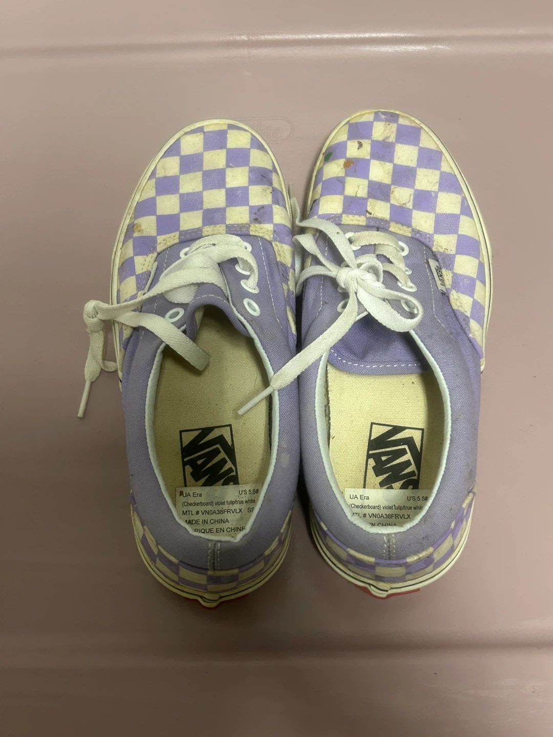 Selling a pair of Vans Era sneakers in a cool checkerboard pattern of lilac and white! They're women's size US 5.5 fits a 7-8. These have been worn and show some signs of use, but still have lots of life left in them. I’ve worn these outside and they look pretty decent if just running errands etc. Needs some cleaning if being worn out, and there were decals added that would need to be cleaned as well.