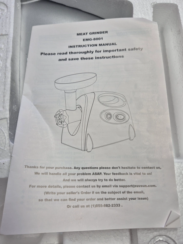 76Selling a meat grinder, model EMG-8001. It comes with the original box and includes stainless steel cutting plates, sausage attachments, stainless steel cutting blades, a kibbe attachment, a food pusher, a brush, and a user manual. Dimensions are 11.7x3.9x11 inches