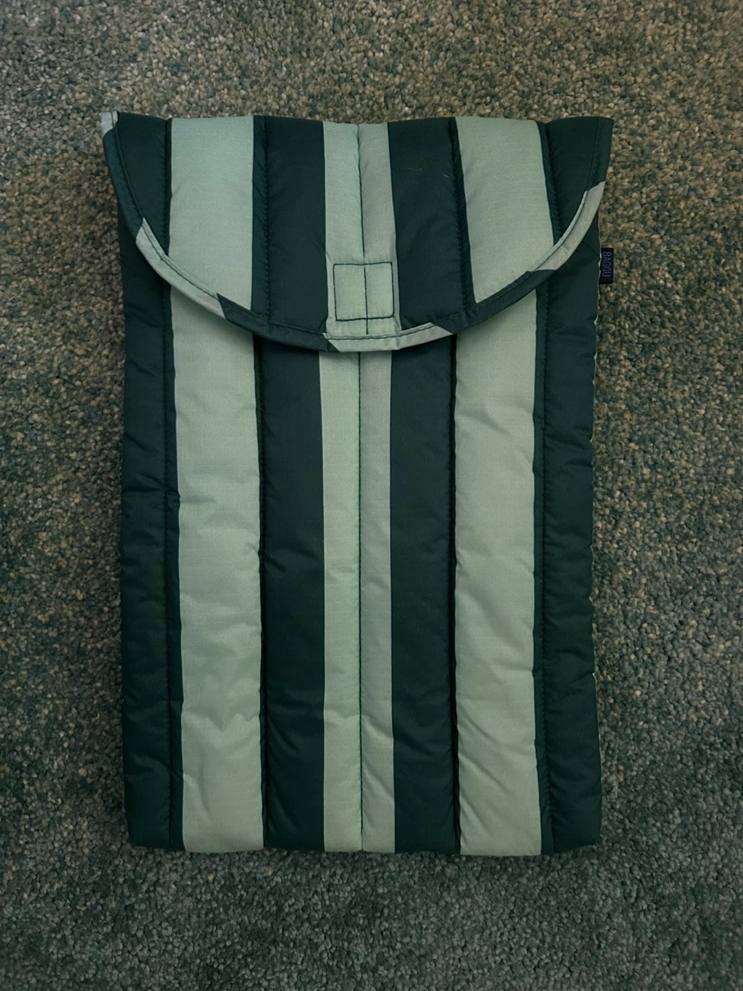 Keep your laptop safe and stylish with this BAGGU puffy laptop sleeve! It fits a 13-inch laptop perfectly. The sleeve is in great condition and features a cool striped design. Perfect for on the go.