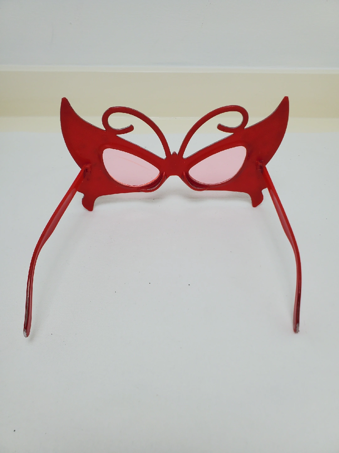 Check out these fun red butterfly wing sunglasses! They're perfect for adding a bit of whimsy to your costume. They feature clear rhinestones and pink tinted lenses. These are in used condition.