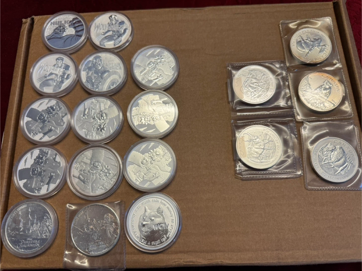 1000+Selling a variety of silver coins, including Marvel characters and Canadian silver coins! They're in great condition and ready for a new home! Each coin is individually packaged. Simpsons $80 each. Pirates of the Caribbean $80each Marvel $95 each SOLD OUT! Canada wildlife series $80 each. Pure silver 1 ounce