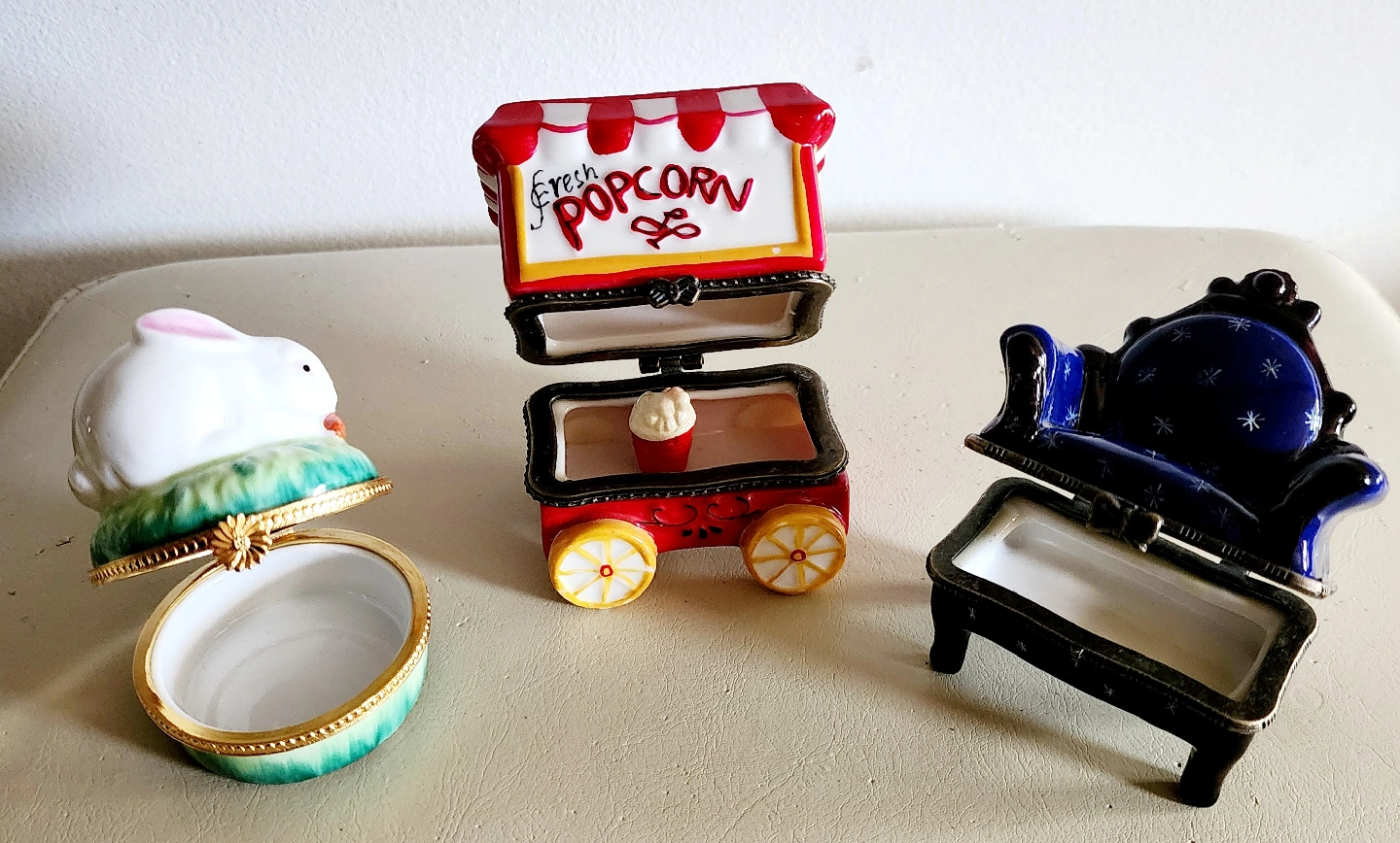 Lilliput Lane Trinket Boxes - Popcorn, Rabbit, Chair. $20 EACH