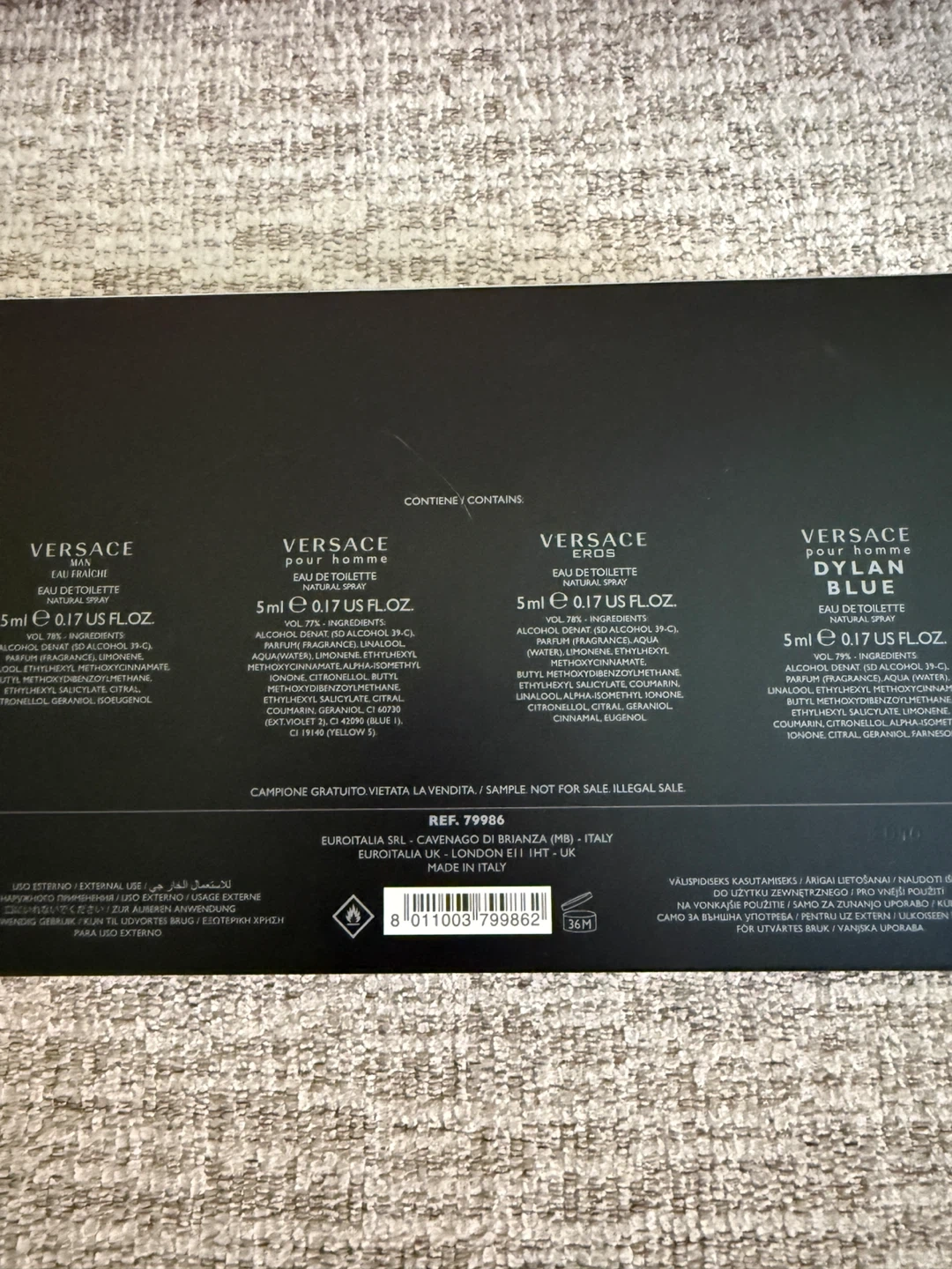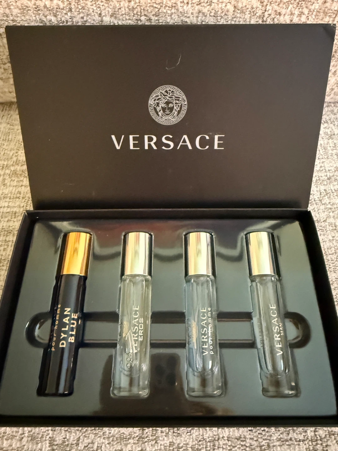1000+Selling a Versace miniatures set for men. This collection includes four different eau de toilette fragrances in 5ml bottles: Versace Man Eau Fraiche, Versace Eros, Versace Pour Homme, and Versace Dylan Blue. Perfect for sampling or travel! The set comes in its original box.