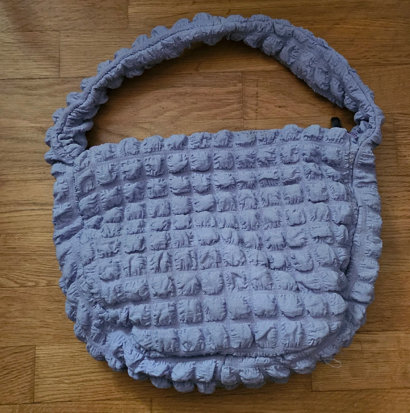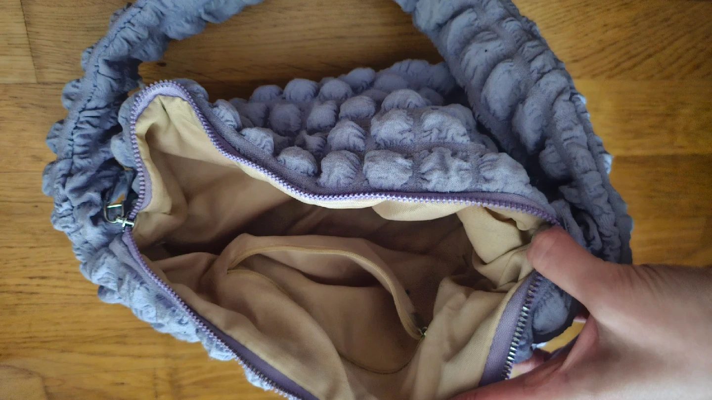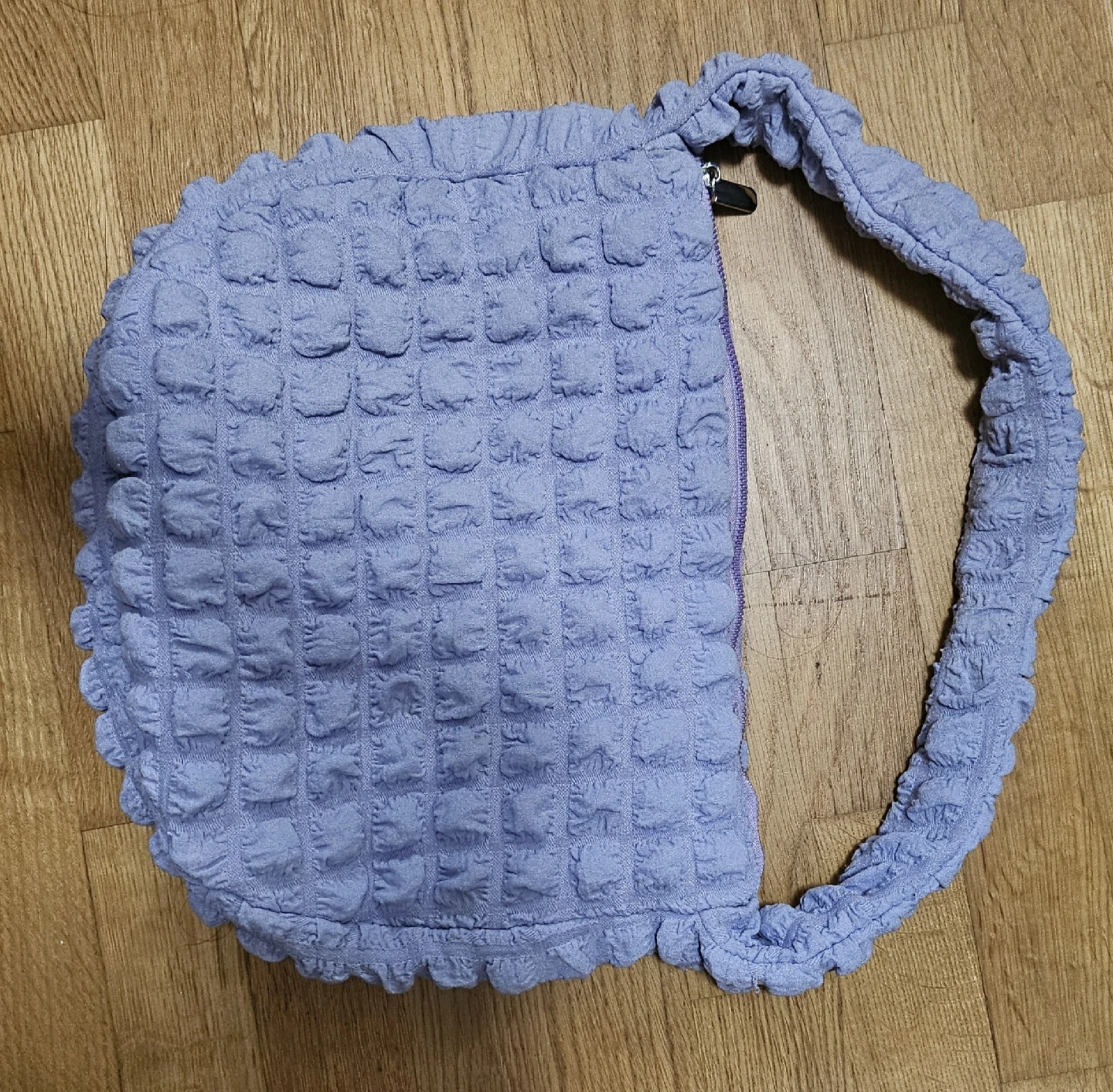 It's a lavendar purple colour, but the photo doesnt capture the colour so well. Medium size bag. Has zipper for the outside, and a zipper for the inside pocket.