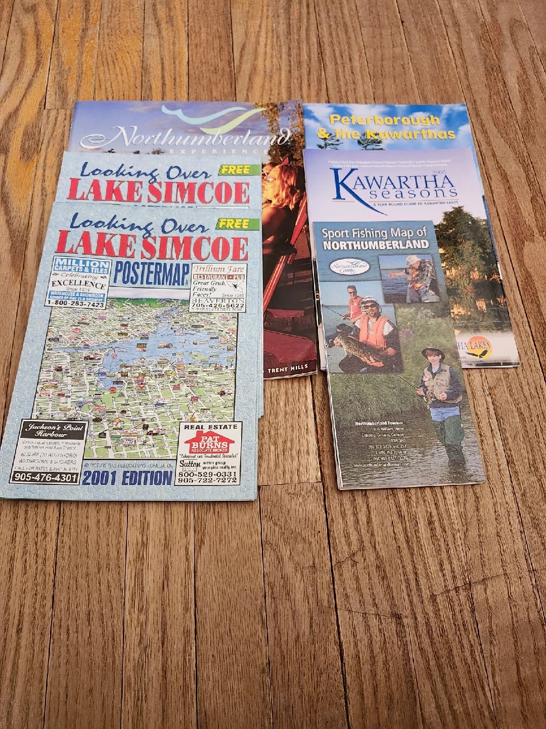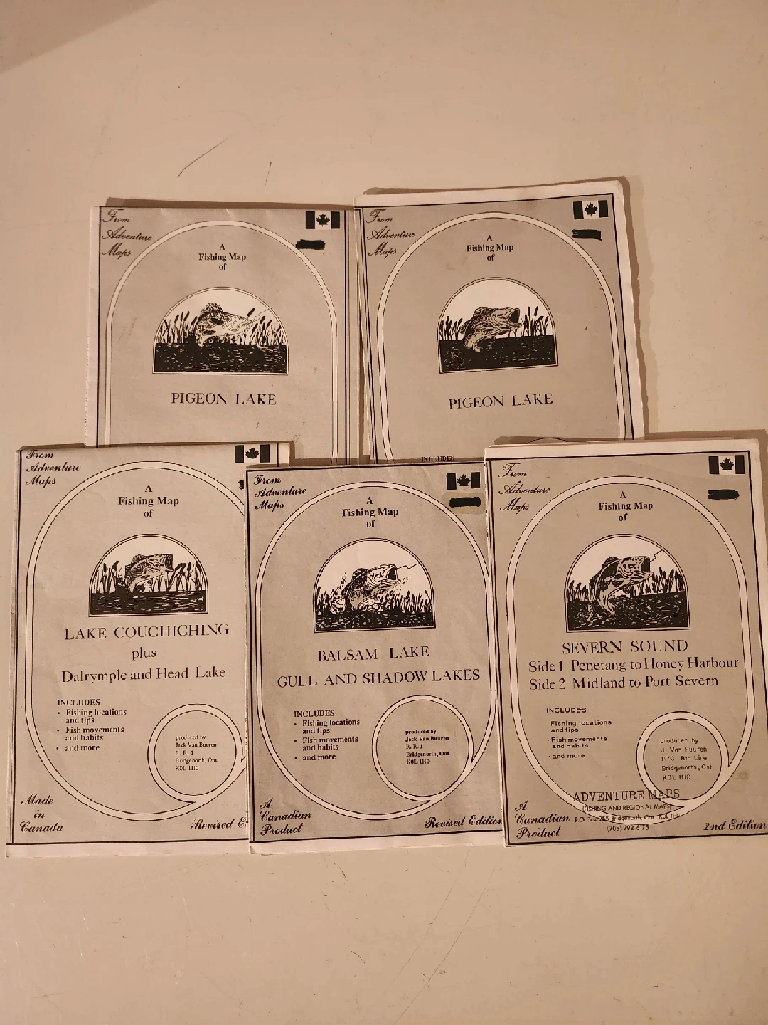 43Adventure fishing maps, $5 each: 2 maps, of Pigeon Lake 1 map, of Balsam, Gull & Shadow Lake 1 map, of Lake Couchiching, Lake Dalrymple & Head Lake 1 map, of Severn Sound, Honey Harbour & Port Severn Fishing books: Sports Afieid, $2 Freshwater Fishing, $10 The Hookbook, $10 Or take all 3 books for $20. Regional & Road maps, $1 each