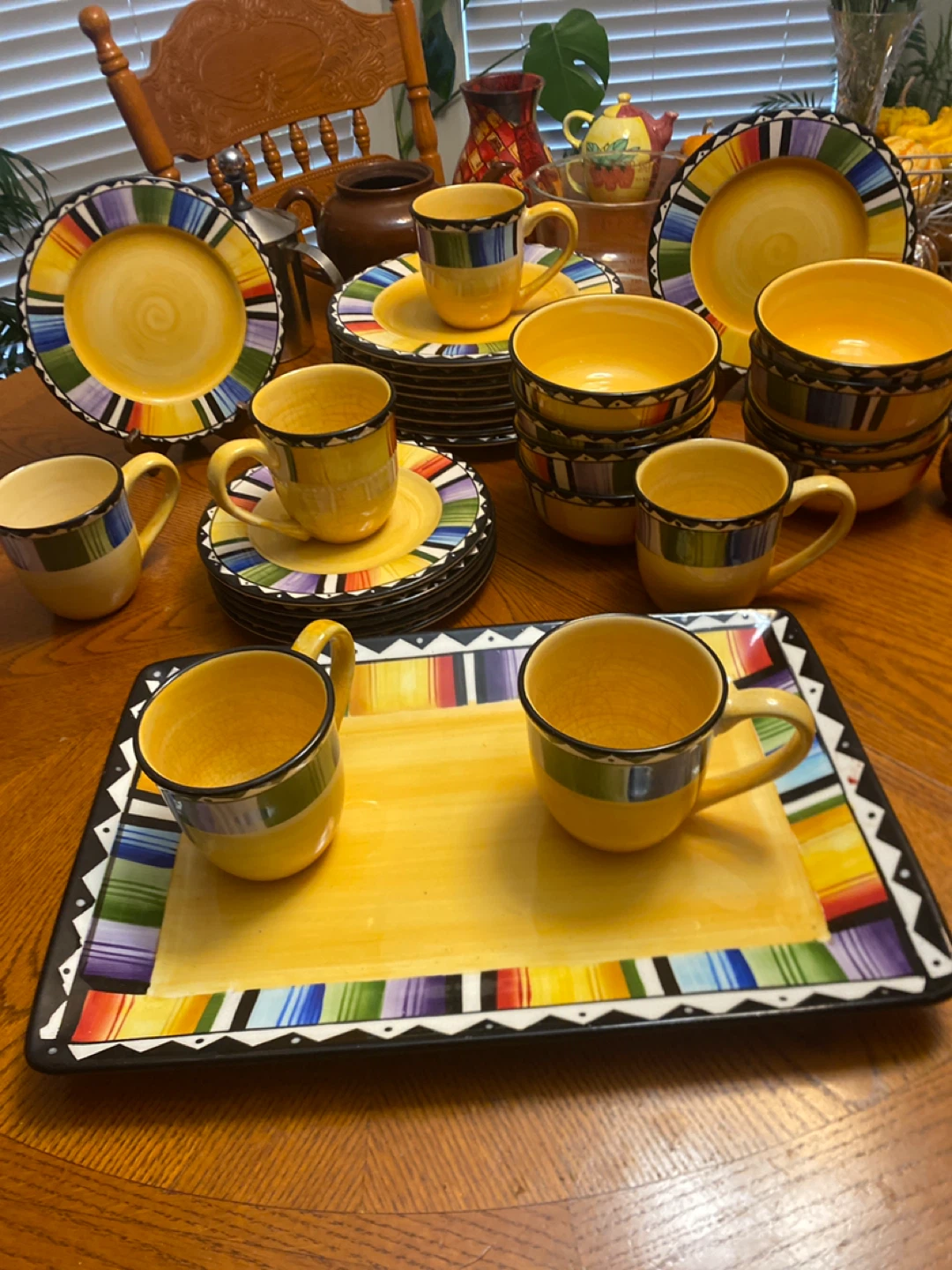 Selling a lovely Gibson Everyday Andalucia dinnerware set! The set features a vibrant yellow colour with colourful stripes and black trim. It's dishwasher and microwave safe, making it super convenient for everyday use. Add a pop of colour to your dining table with this beautiful set!