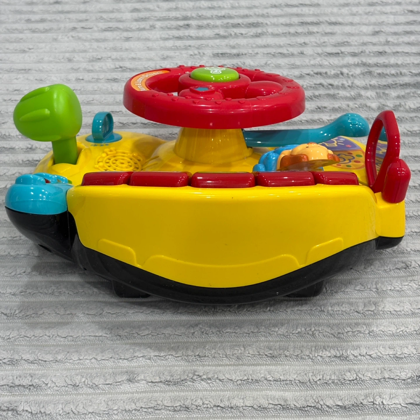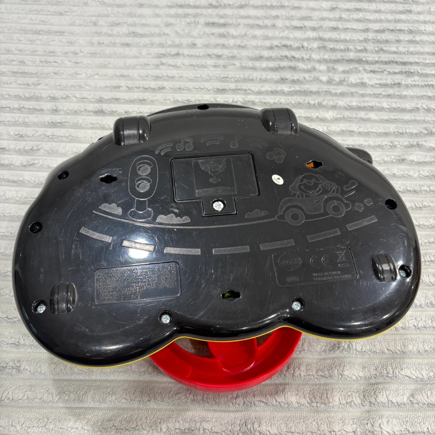 It features a steering wheel, gear shifter, signal lever, and a light-up traffic signal to encourage imaginative play.