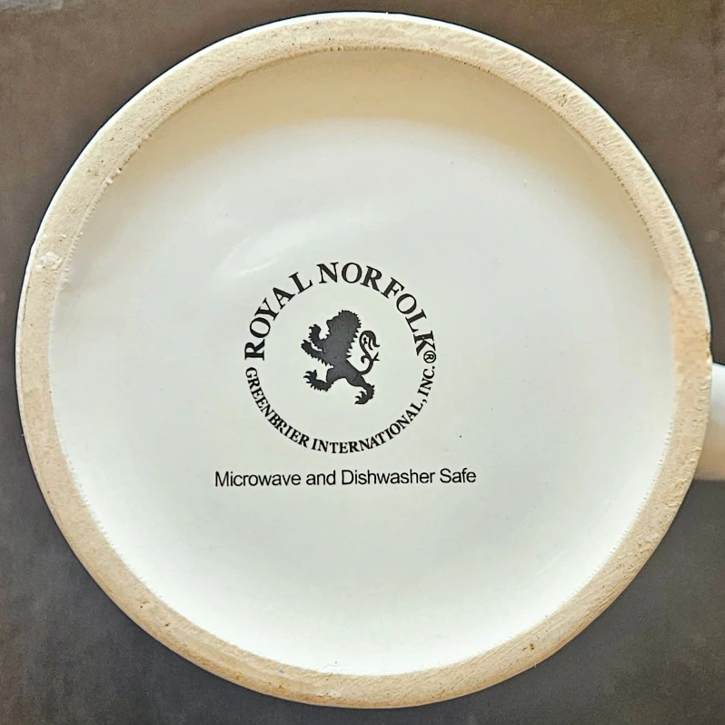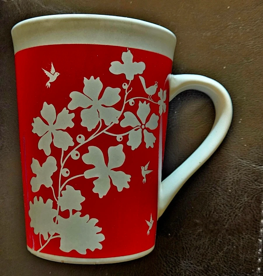 A charming Royal Norfolk mug featuring a vibrant red background and a delicate white floral design. It's microwave and dishwasher safe, making it both beautiful and practical for everyday use. Perfect for adding a touch of elegance to your morning coffee or tea!