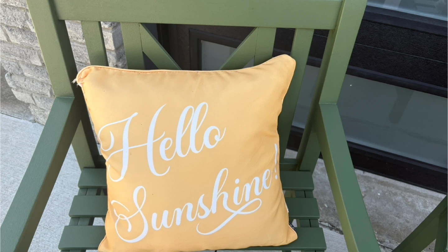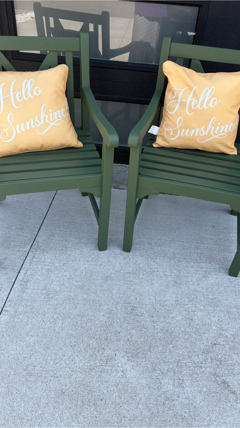 15Two beautiful outdoor chairs in deep green with decorative pillows for a pop of colour. Great for the front porch or as extra seating in the backyard. Paint also seals so chairs can be left outside.