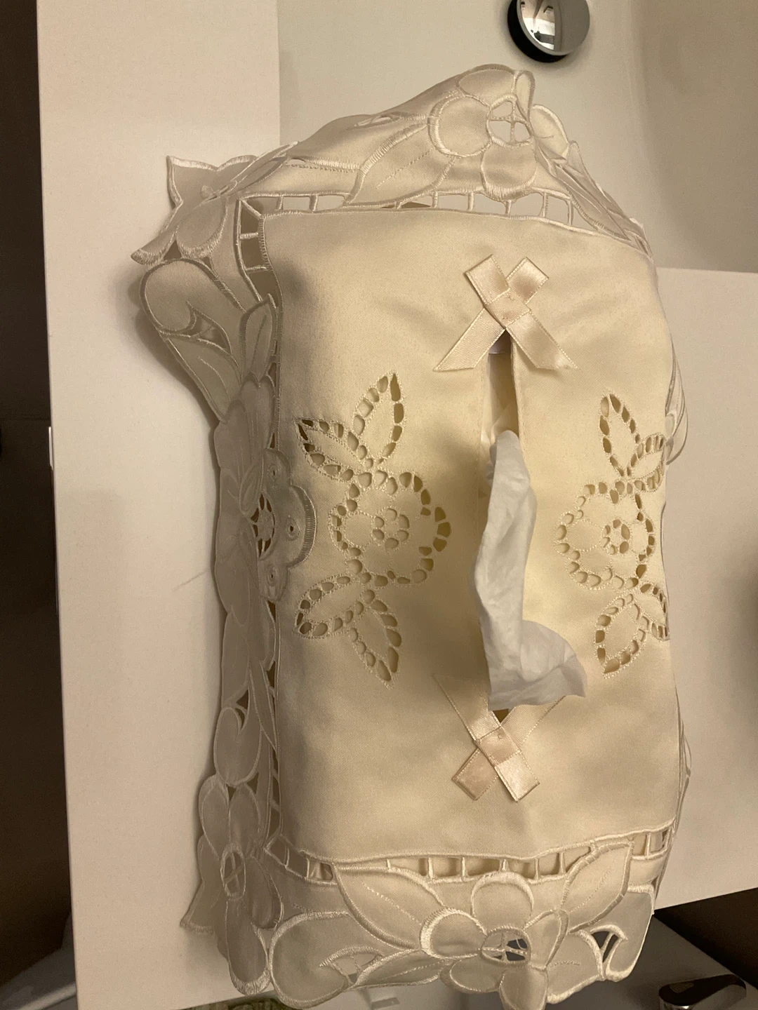 Add a touch of elegance to your bathroom or living room with this beautiful embroidered tissue box cover! It's in new condition and features a delicate floral design with cute little bows. The cream colour will complement any decor