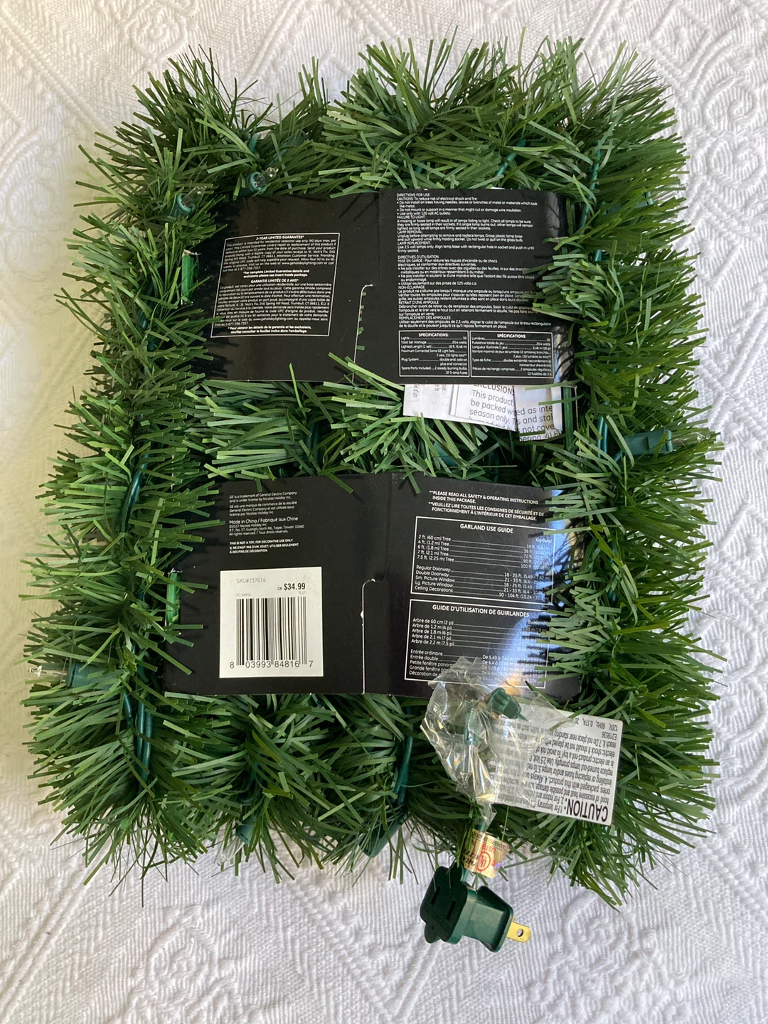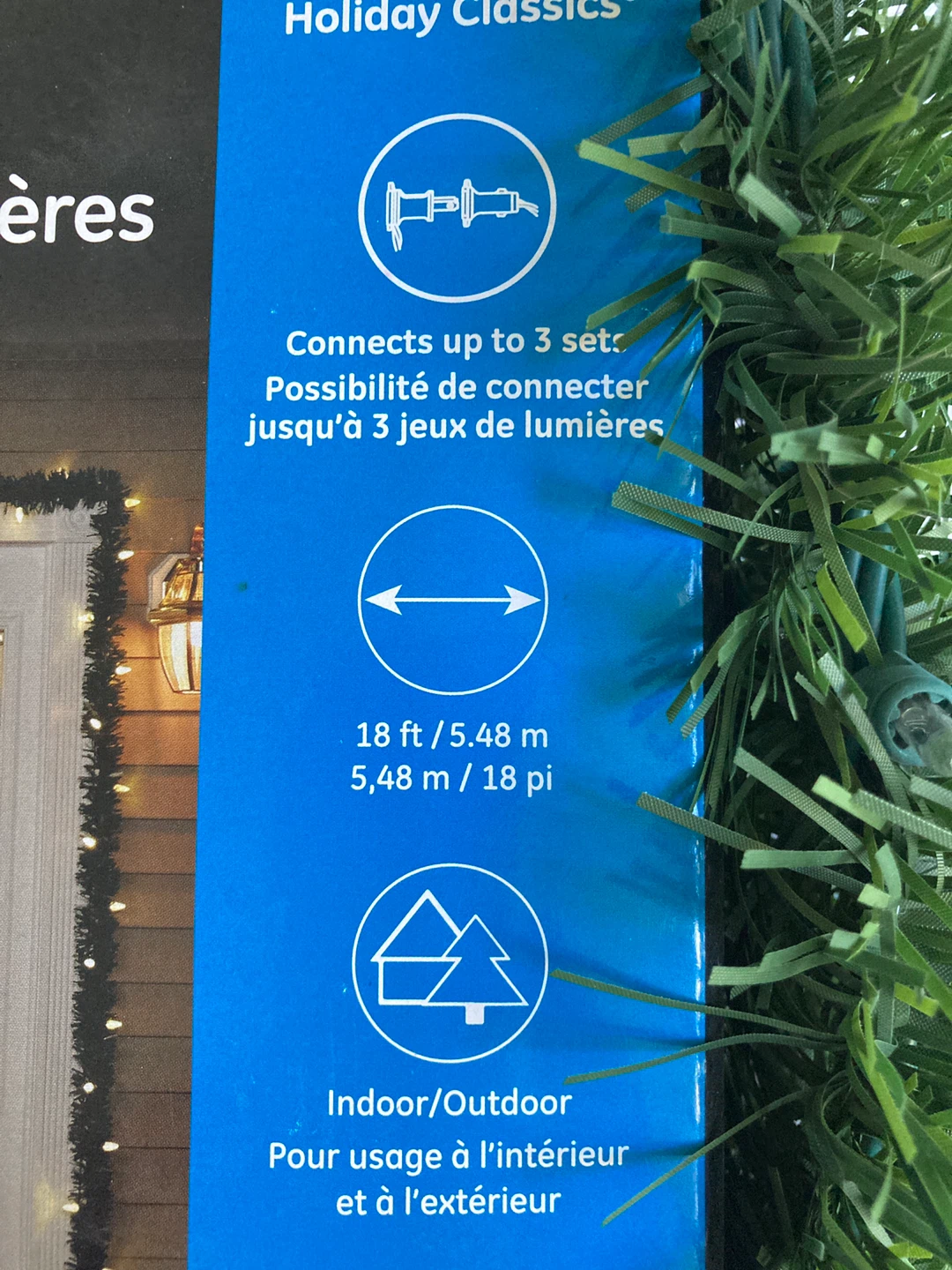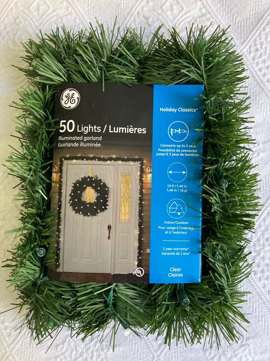 Selling a GE Holiday Classics illuminated garland with 50 lights. It can connect up to 3 sets and is suitable for both indoor and outdoor use. The garland is 18 ft / 5.48 m long. Originally bought for $34.99