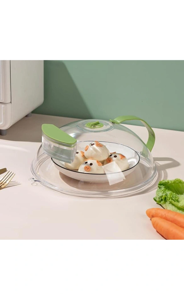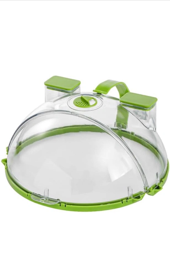 This food cover is perfect for keeping your food fresh and protected! It has a clear dome so you can easily see what's inside, and a convenient green handle for easy lifting and carrying