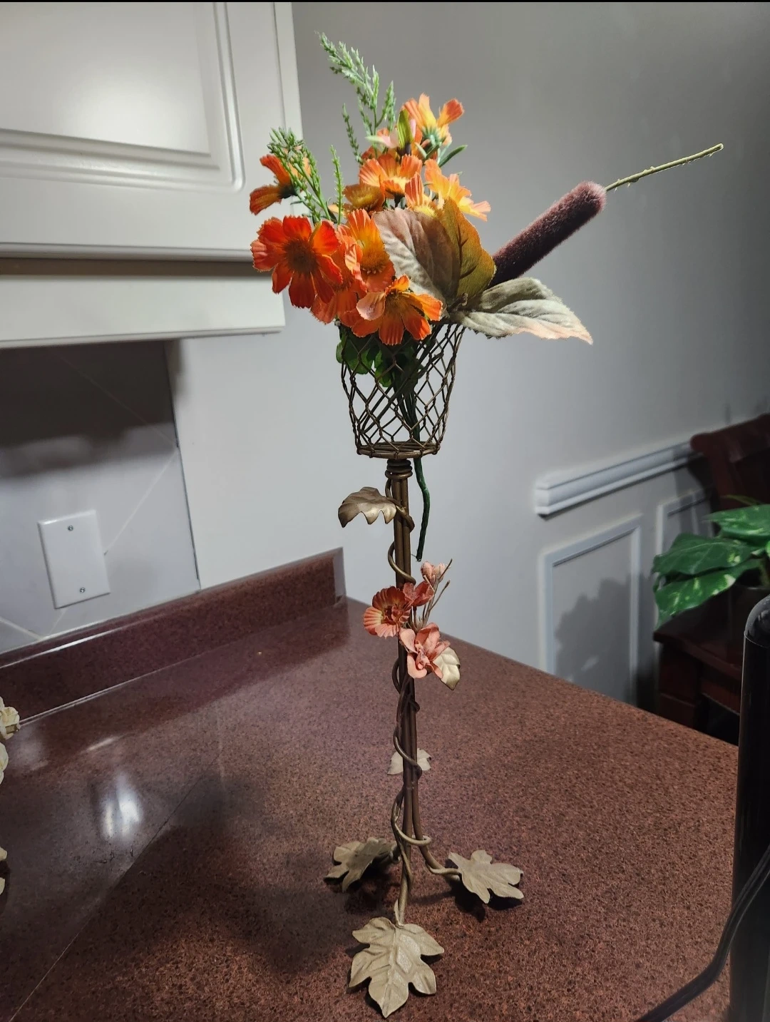 A lovely floral arrangement with a decorative stand. It's in great condition and would look lovely in any room of your home. The flowers are a mix of orange and brown, and the stand has leaf accents.