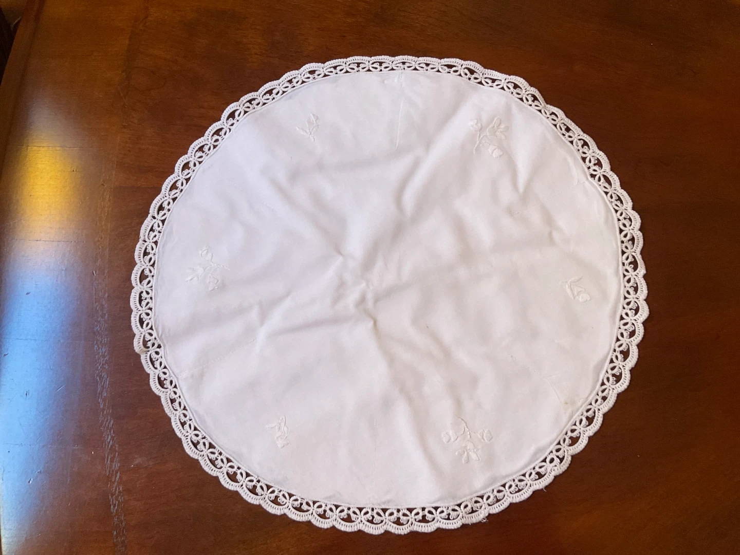 Selling a lovely vintage white embroidered fabric bread roll dish! It's in new condition and would be a charming addition to any home. Perfect for holding dinner rolls on your dining room table, or other small items. The delicate embroidery and lace trim add a touch of elegance