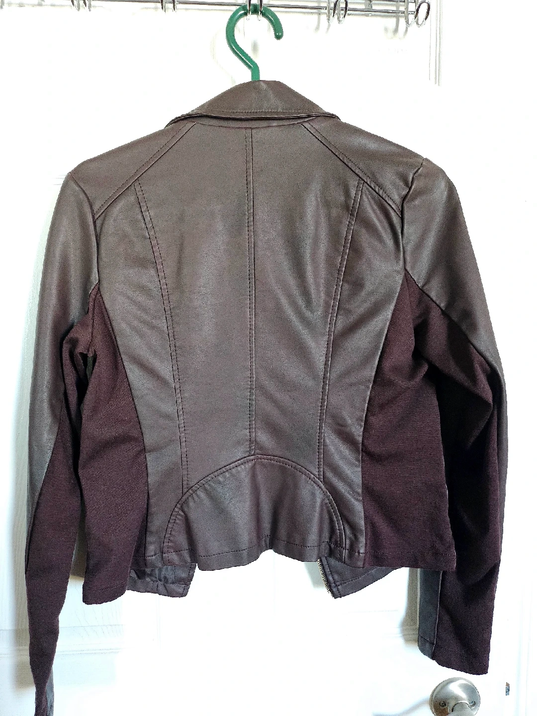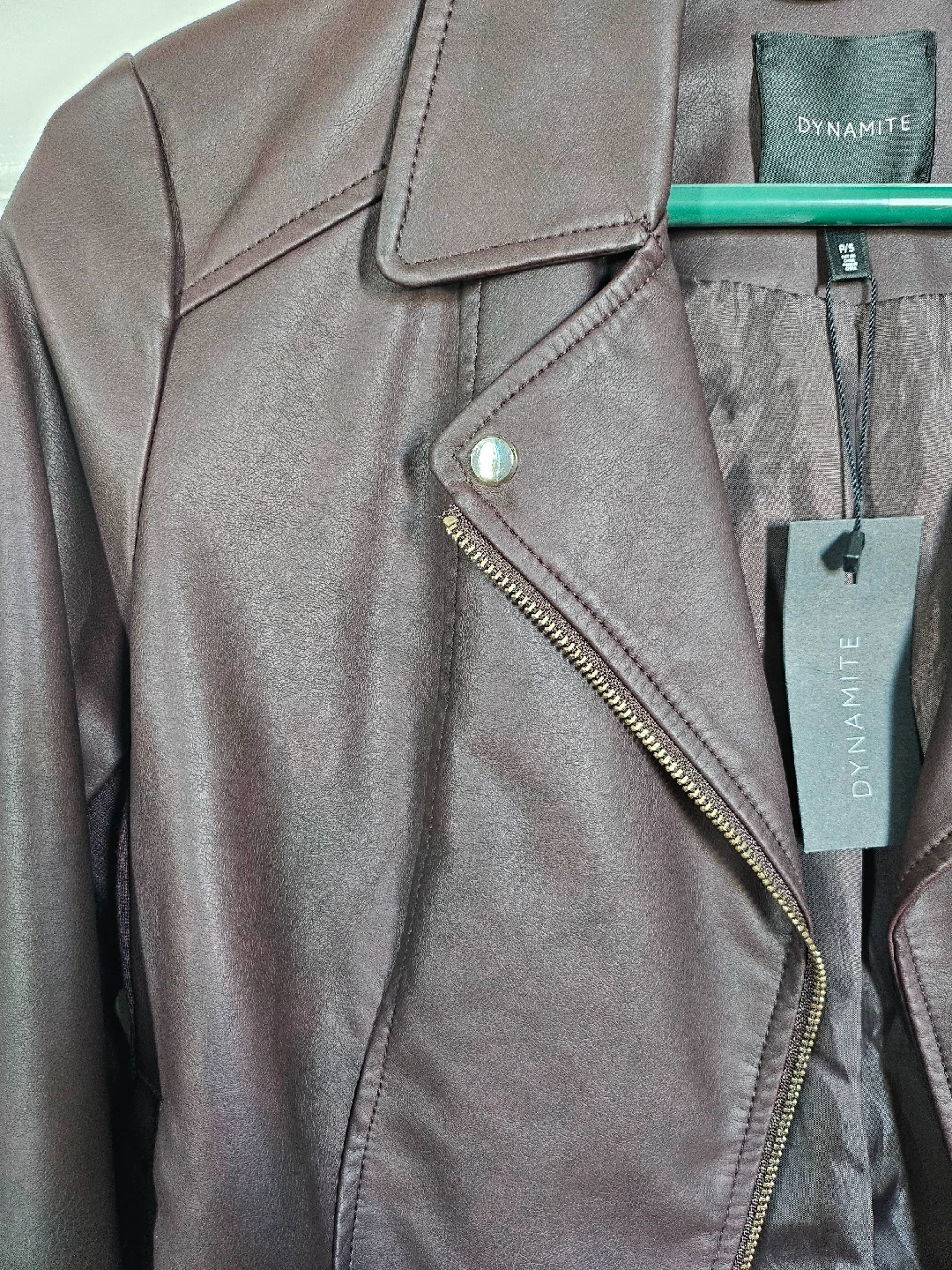 Add a chic edge to any outfit with this stylish Dynamite faux leather jacket in a burgundy. Perfect for fall or spring, this moto-style jacket pairs beautifully with jeans, dresses, or skirts.