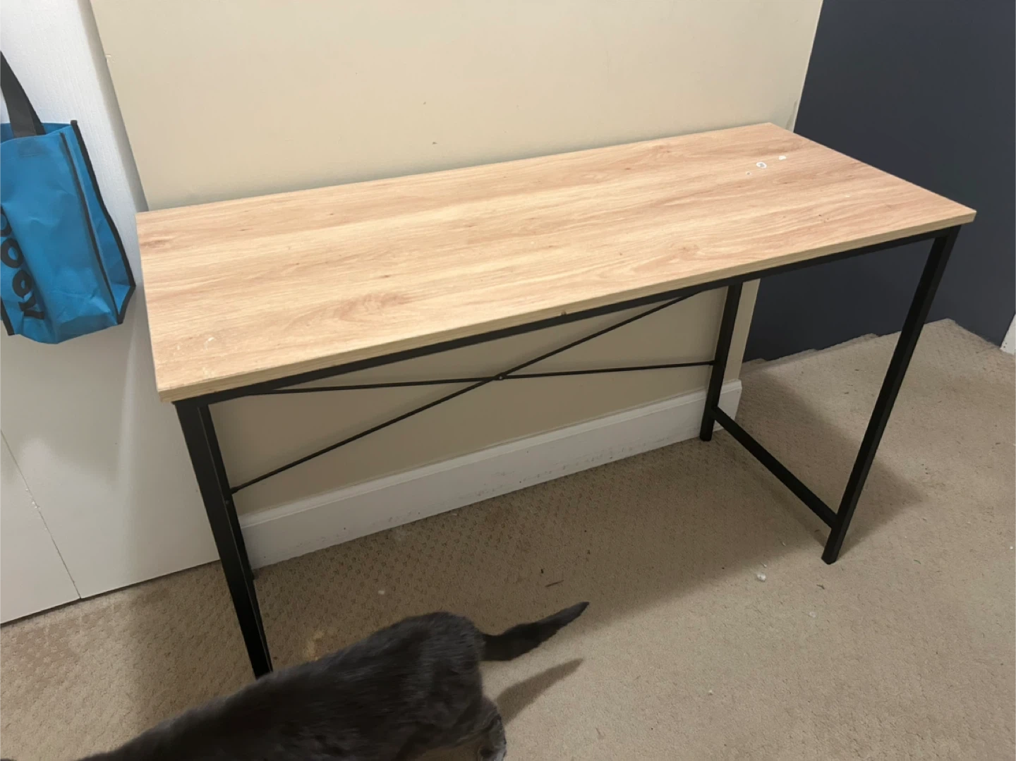Selling a simple light wood desk with black metal legs. It's in good shape and perfect for a home office or study space. It's sturdy and provides a good amount of workspace. Ready for a new home! The top has some imperfections but it’s still a good piece!