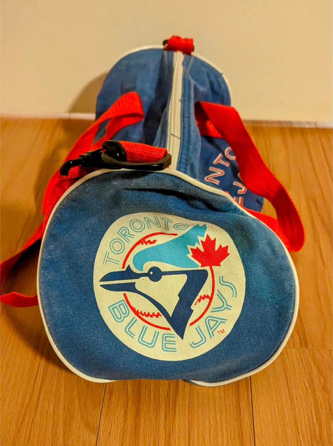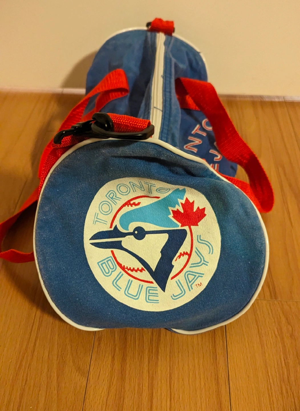 Selling a Toronto Blue Jays duffle bag. It's blue with red straps and features the Blue Jays logo. Perfect for carrying your gear to the game or the gym!