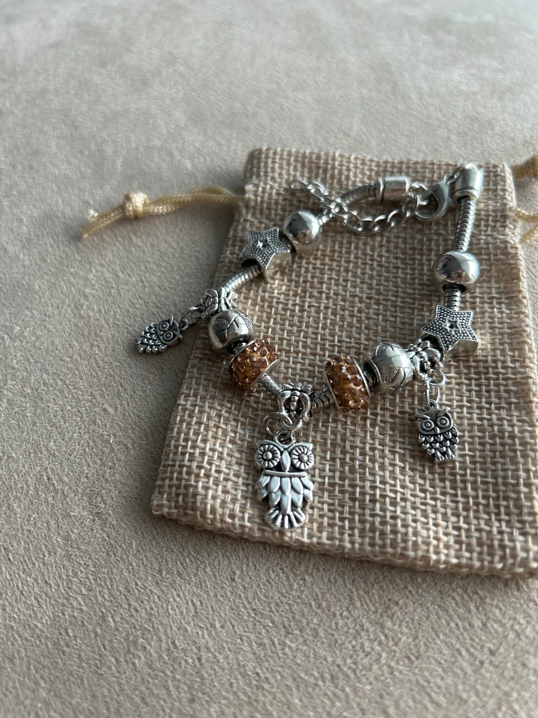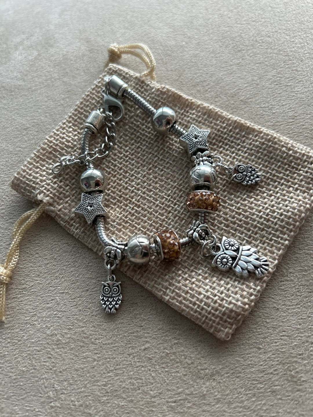90Selling a cute charm bracelet! It features various charms, including adorable owls and stars. The bracelet is in great condition and comes with a small pouch.