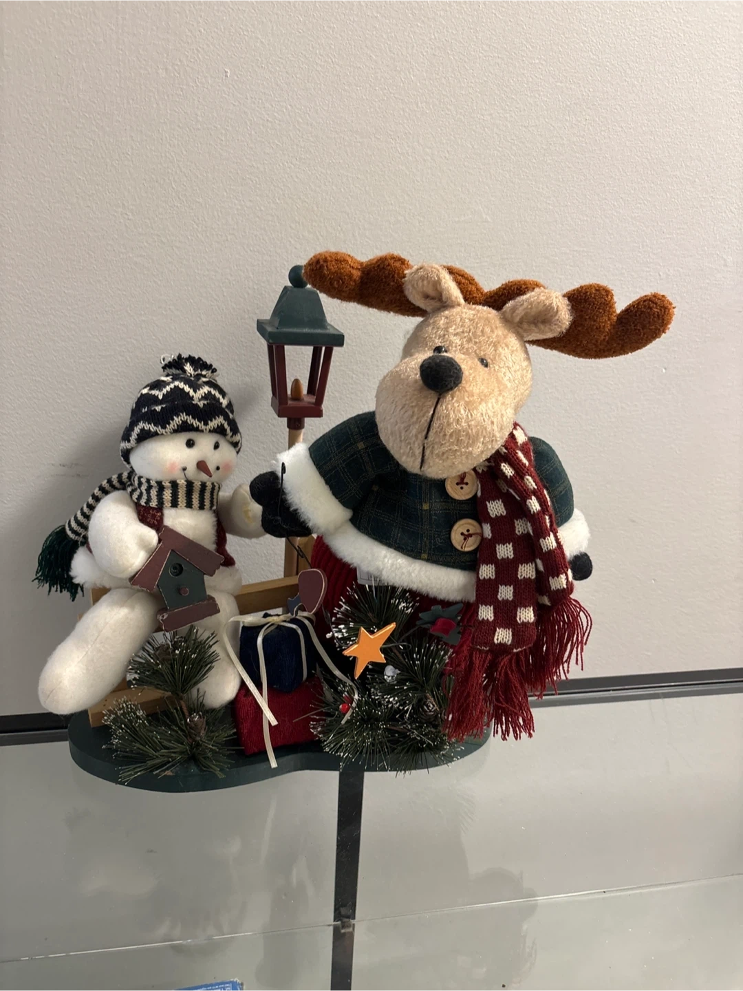 A cute Christmas decoration featuring a moose and a snowman. Perfect for adding a festive touch to your home this holiday season!