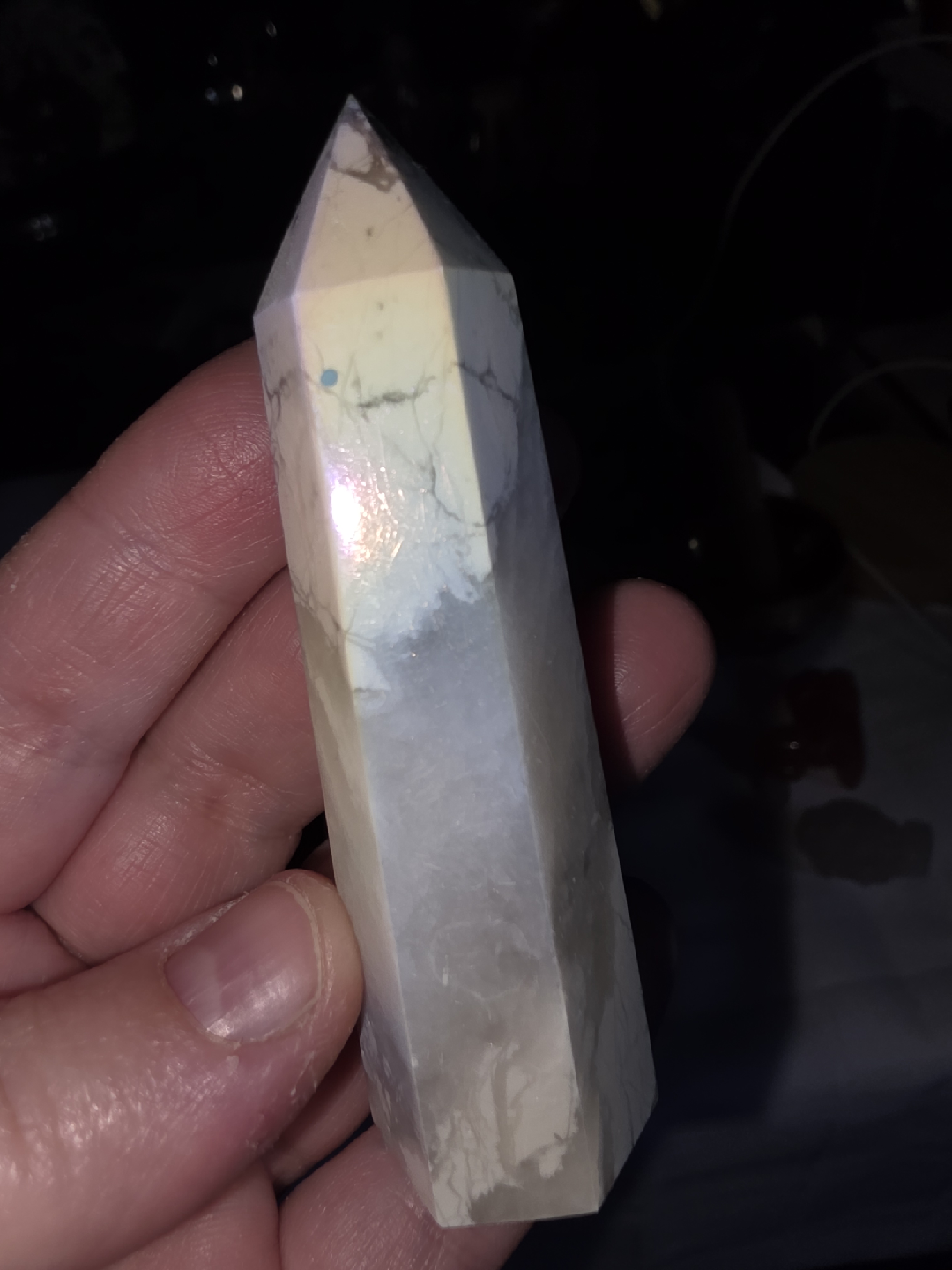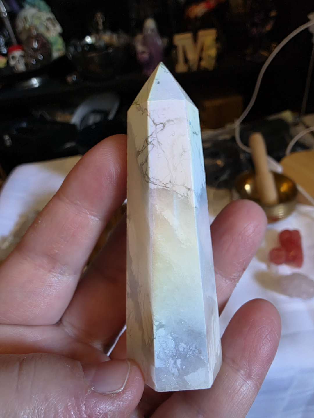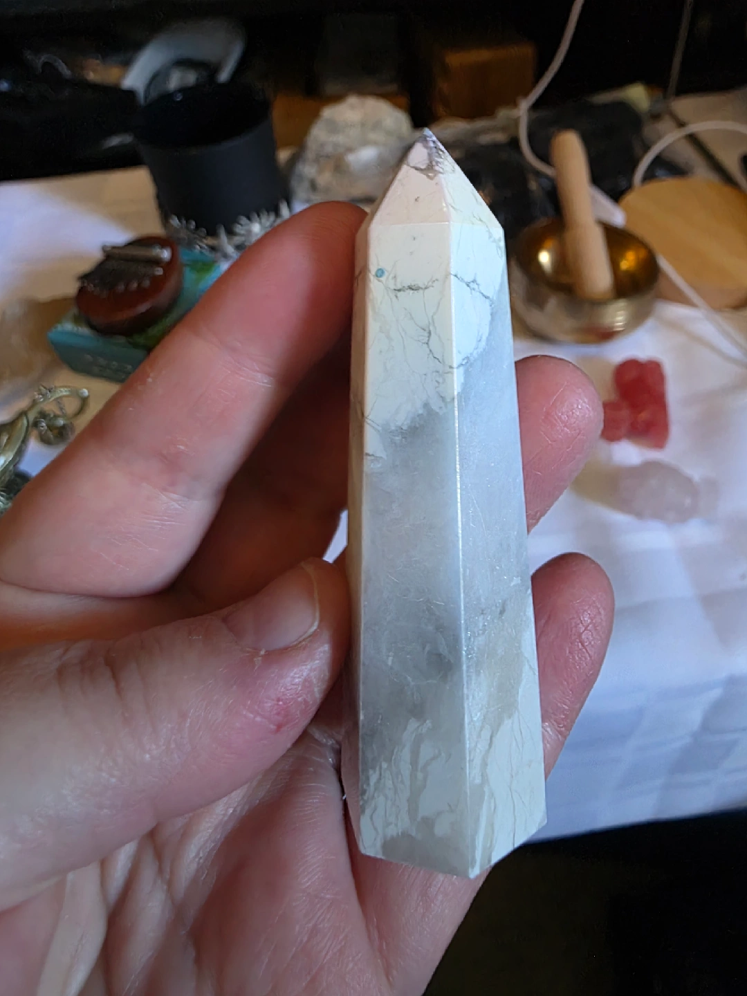 Selling a beautiful howlite crystal tower point. It has a lovely white and grey marbled pattern. Perfect for adding to your crystal collection or using for energy work. auratized. pickup is in my building near High Park Station.
